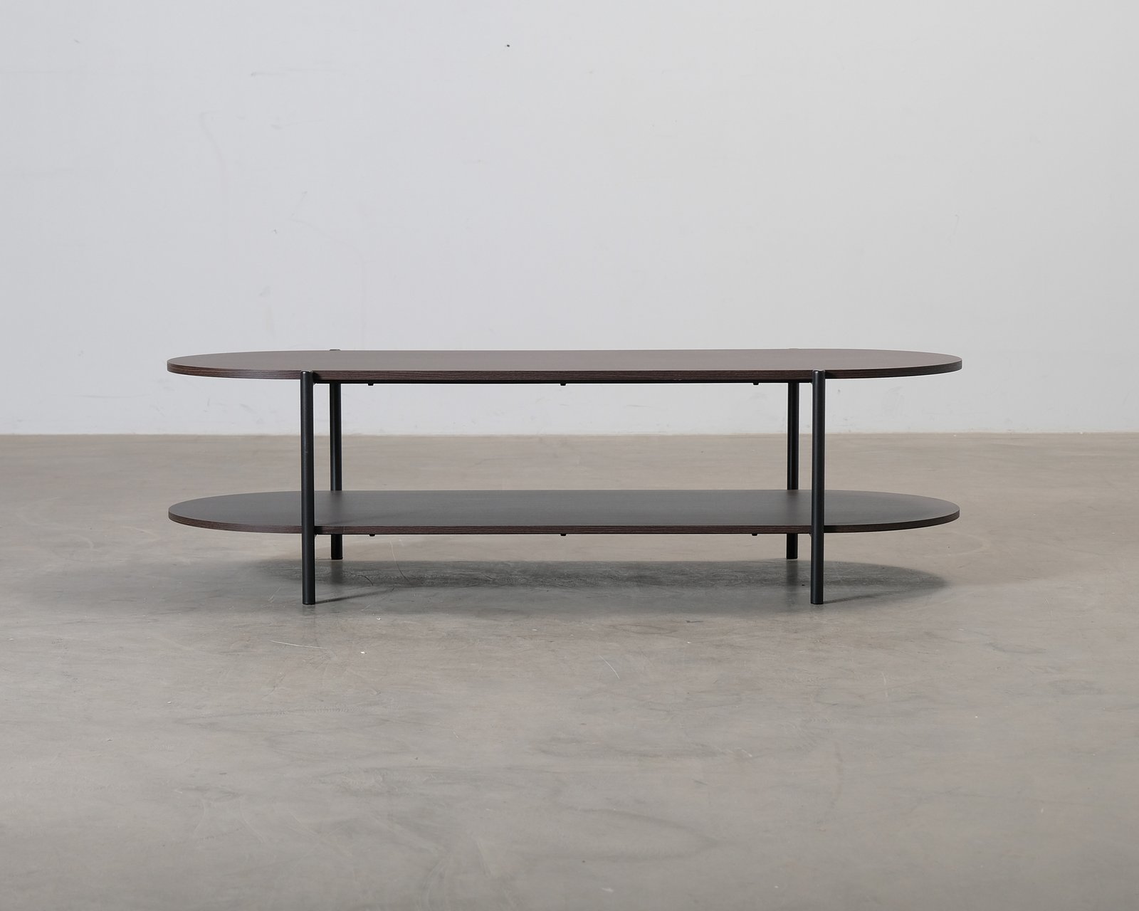 Mio Zendra är ett modernt ovalformat soffbord med en praktisk hylla, lättskött melaminyta och svart metallram. Litet märke på bordsskivans ände samt på undersidans kant. Helhetsintrycket är fint.