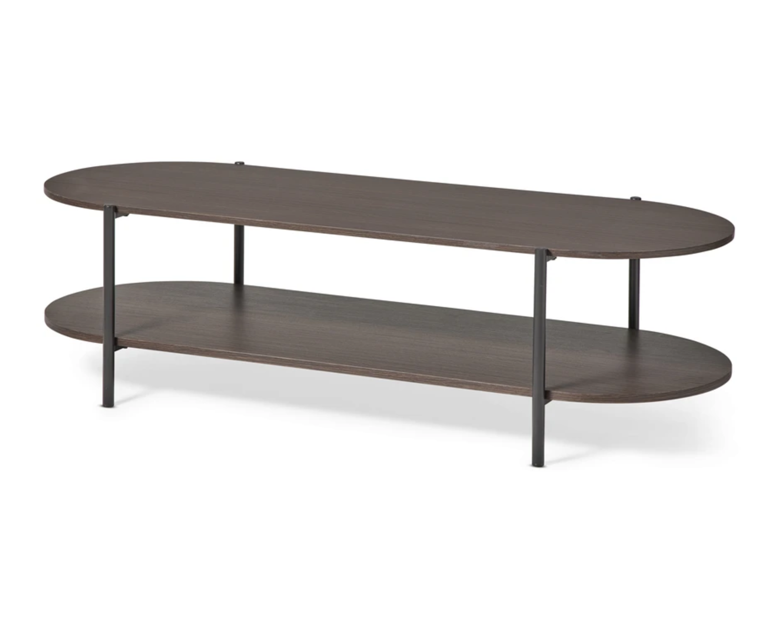 Mio Zendra är ett modernt ovalformat soffbord med en praktisk hylla, lättskött melaminyta och svart metallram. Det finns ett litet märke på ett ben. Helhetsintrycket är bra.