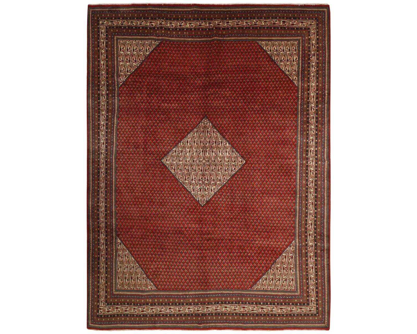 Persian Mir Boteh är handknutna mattor som huvudsakligen tillverkas i Sarough-området. De känns lätt igen på sitt speciella mönster, som består av mindre mir-e Butha. Mönstret har en karakteristisk päronliknande form och anses av många symbolisera en flamma som står för värme och liv. Flammotivet förekommer ofta i bakgrundsmönstret på persiska mattor. Oanvänd.