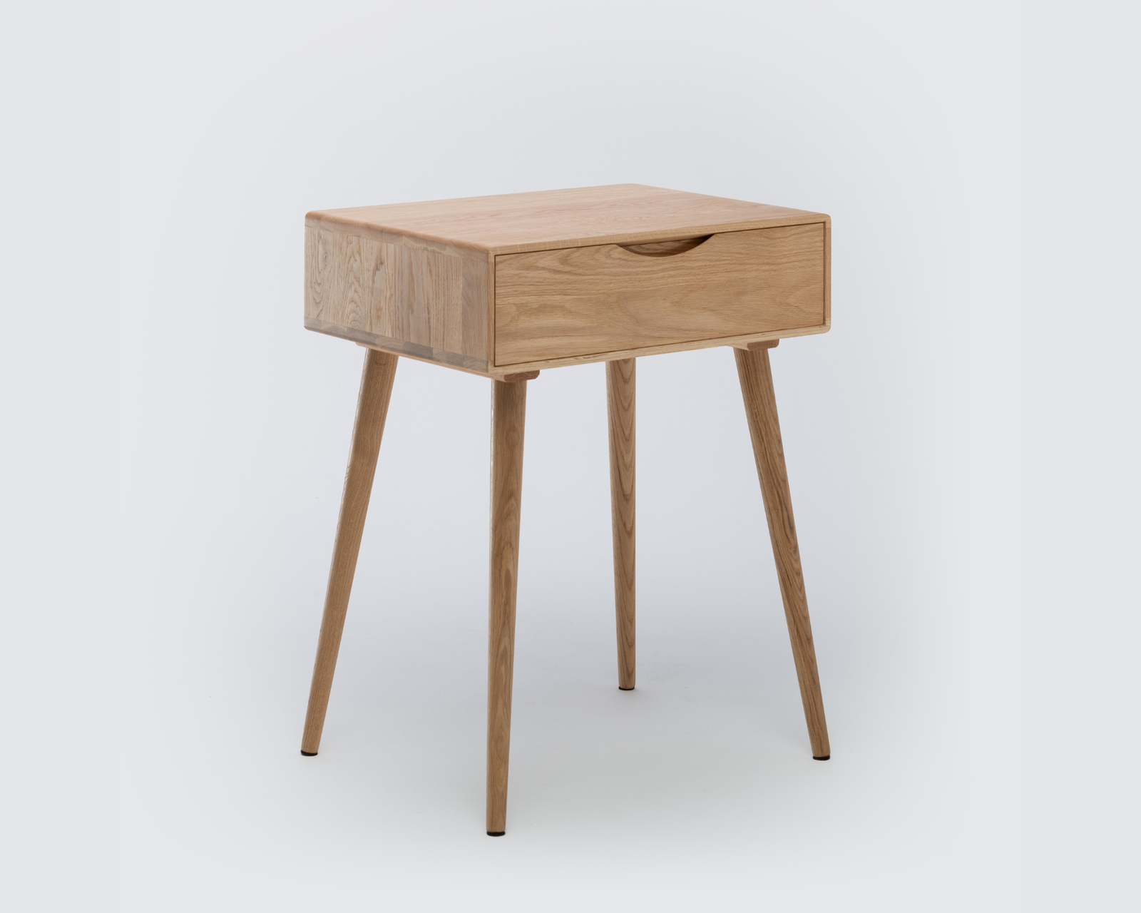 Med sin kompakta storlek och Scandi-stil passar det här eleganta sidobordet bra bredvid en säng eller soffa. Bordet har en enda låda som öppnas och stängs ljudlöst och är tillverkat av hållbart massivt ek. Handgjord i Bosnien och Hercegovina. Oanvänd. Levereras omonterad.
