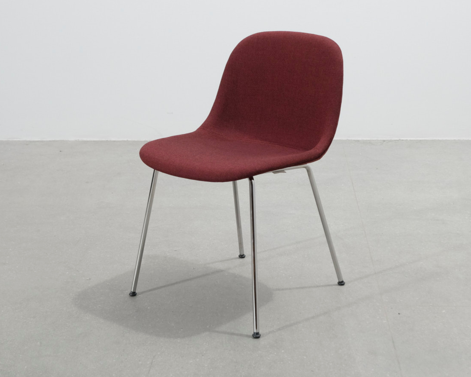Fiber Side stolen är formgiven av Iskos-Berlin för det danska märket Muuto. Fiber har ett tydligt formspråk som inte kompromissar med ergonomi – varje linje är utformad för att ge maximal komfort. Stolen är klädd i rött Sabi tyg och benen är i förkromat stål. Oanvänd.