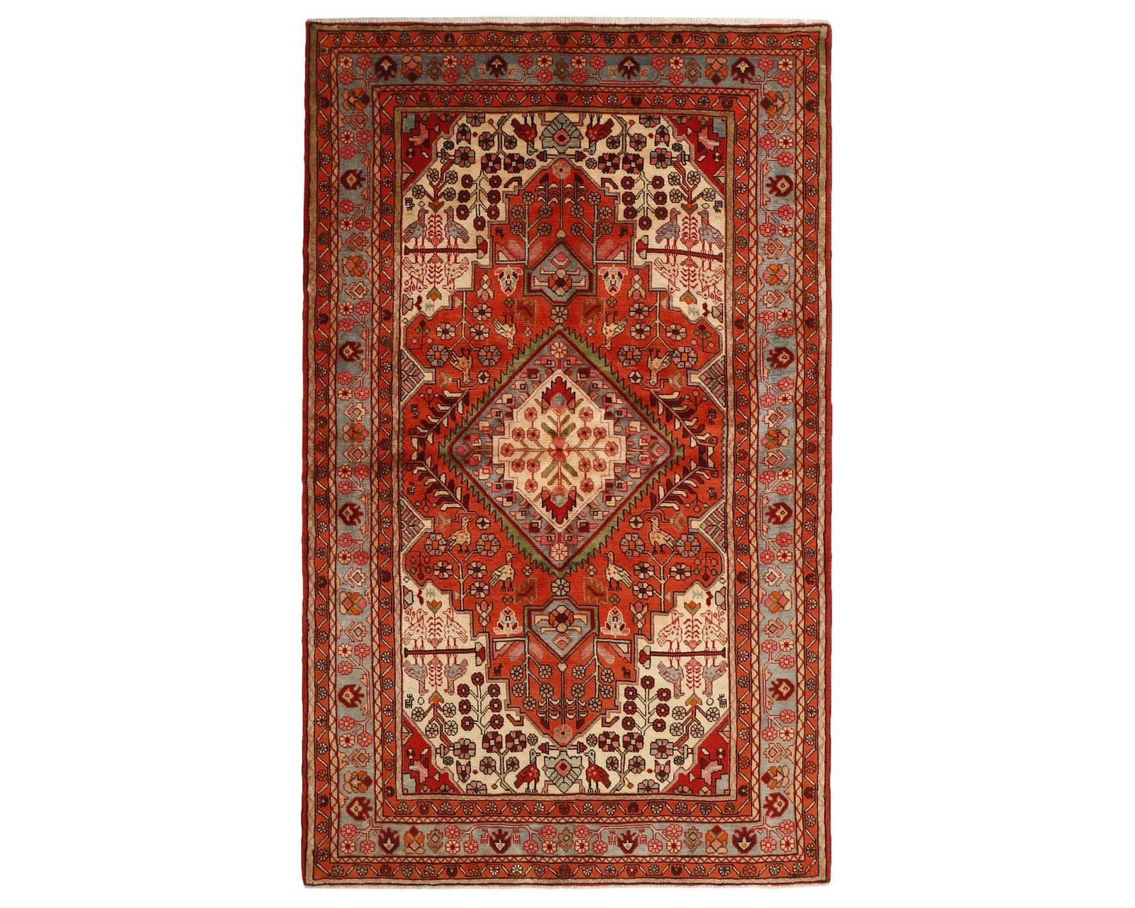 Nahavand-mattorna är handknutna ullmattor med varp i bomull. Deras mönster är rurala tolkningar av klassiska motiv och har vanligtvis en central medaljong med dekorativa hörnelement. Färgskalan är varm och jordnära, med inslag av rött, brunt, blått och grönt som ger ett harmoniskt uttryck. Knuttätheten varierar mellan 150 000 och 250 000 knutar per kvadratmeter. Oanvänd.