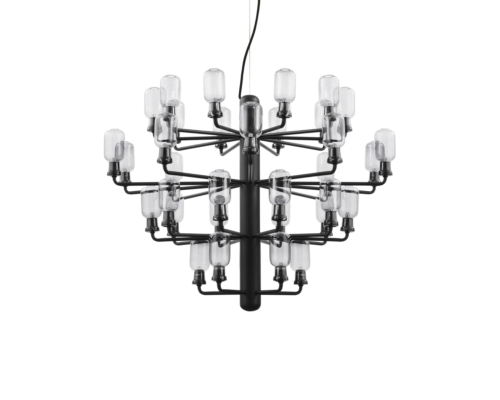 Normann Copenhagens Amp ljuskrona kombinerar stiligt glas, marmor och metall. Den moderna armaturen är inspirerad av gamla rörradion. Designad av Simon Legald. Oanvänd.