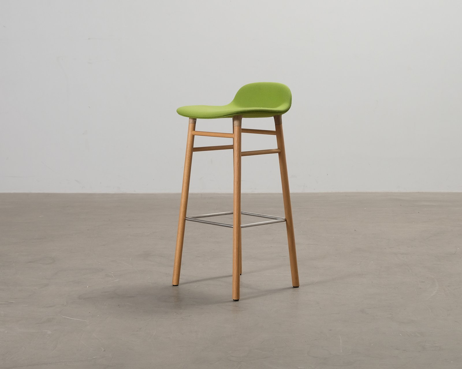 Barstol ur Normann Copenhagens Form möbelkollektion. Stolen är omsorgsfullt designad – tack vare ett unikt cup-system ser benen ut att växa ur skalet. Ekben och sits i tyg. Formgiven av Simon Legald. Normalt bruksslitage på benen. Några svagt synliga fläckar på klädseln som inte gick bort med textilrengöring.