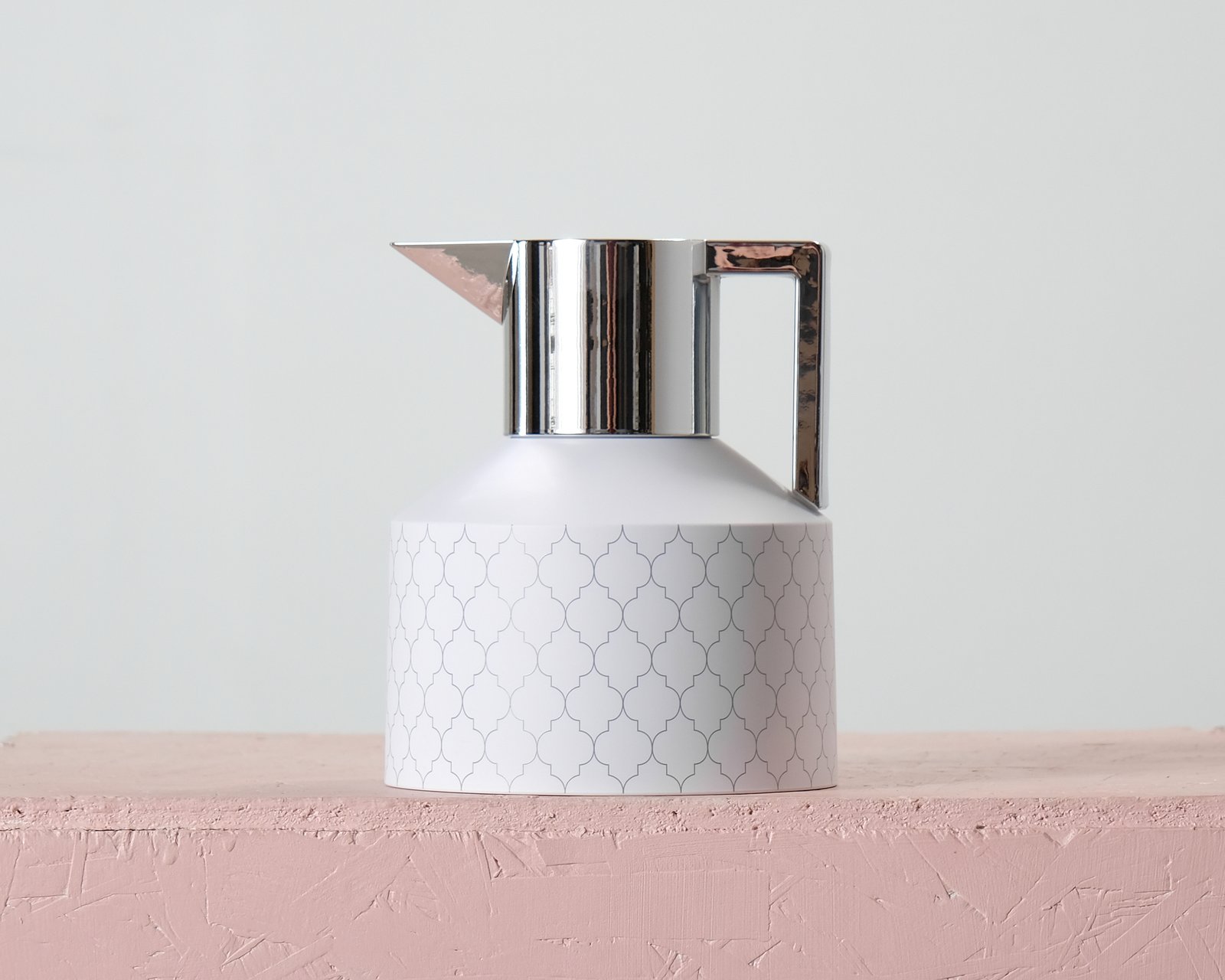 Geo termoskannan kännetecknas av sin moderna, grafiska design och är ett stilfullt inslag i både vardag och fest. Kannans kropp är tillverkad av plast och har en effektiv värmeisolering som håller drycker varma eller kalla i flera timmar. Geo är lätt och praktisk – perfekt för att servera kaffe, te eller kalla drycker. Det tätslutande locket förhindrar spill, och den skulpturala formen gör kannan till ett snyggt blickfång på matbordet eller i köket. Oanvänd.