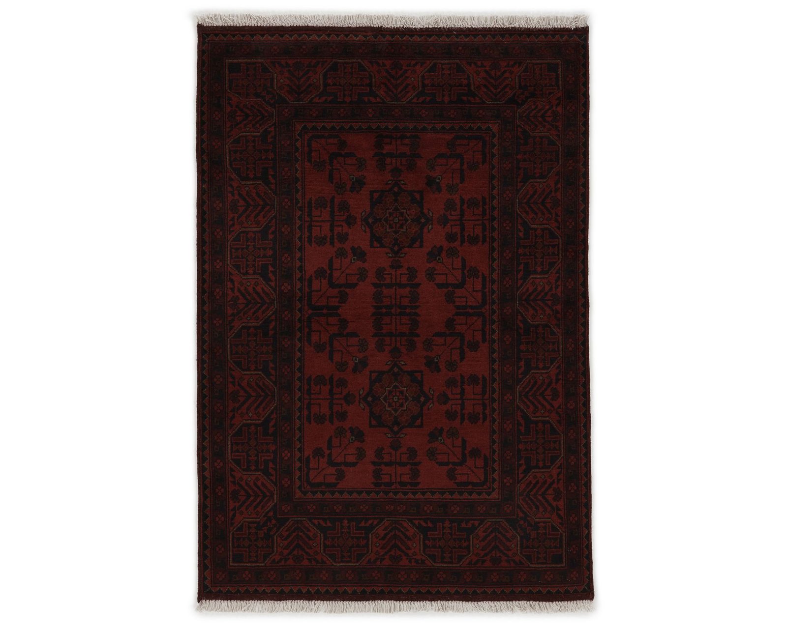 Old Afghan-mattorna är handknutna ullmattor som utmärks av en djup, varm röd bottenfärg kombinerad med mörkblå mönsterdetaljer samt inslag av ockra och beige. Den relativt höga, stadiga luggen innehåller ofta get- och hästhår, vilket ger mattorna en robust karaktär. Traditionella Gül-motiv och senehknutning skapar en rytmisk mönsterstruktur. Knuttätheten ligger mellan 150 000 och 250 000 knutar per kvadratmeter. Oanvänd.