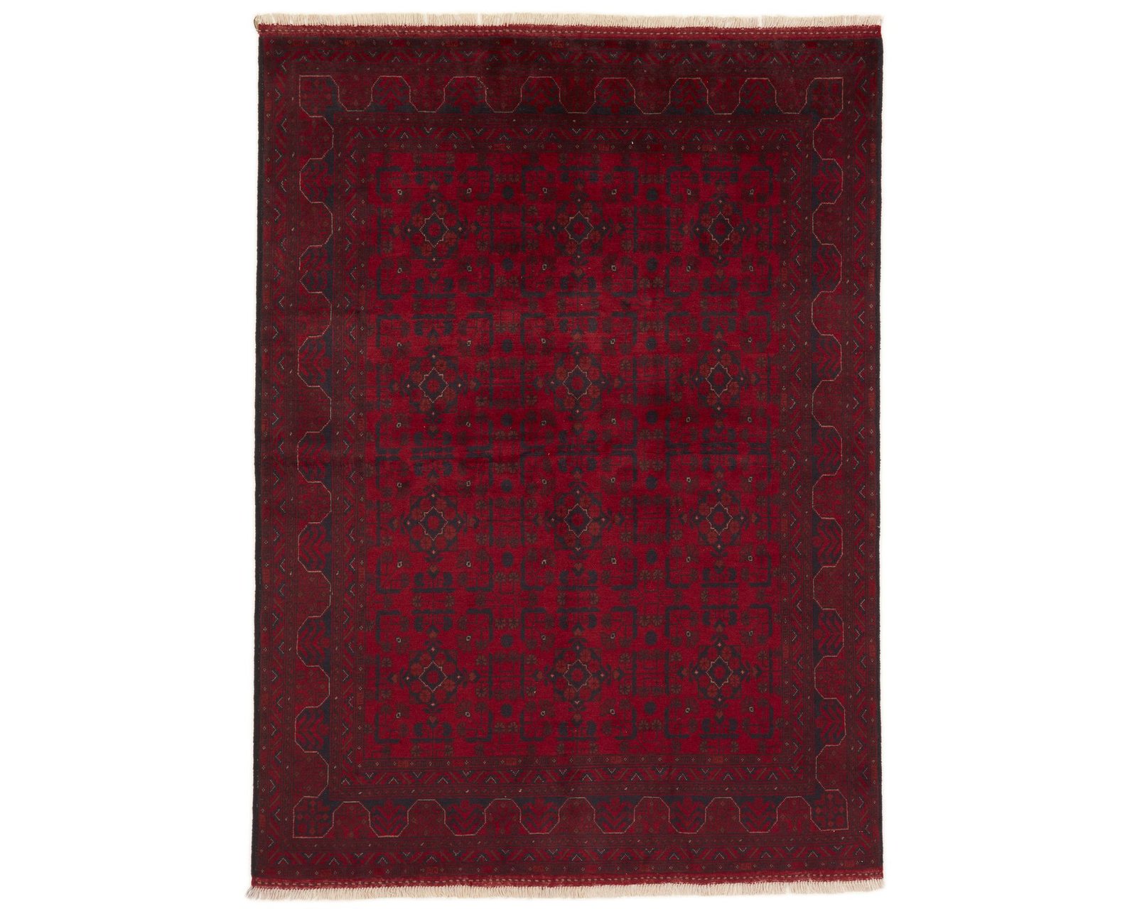 Old Afghan-mattorna är handknutna ullmattor som utmärks av en djup, varm röd bottenfärg kombinerad med mörkblå mönsterdetaljer samt inslag av ockra och beige. Den relativt höga, stadiga luggen innehåller ofta get- och hästhår, vilket ger mattorna en robust karaktär. Traditionella Gül-motiv och senehknutning skapar en rytmisk mönsterstruktur. Knuttätheten ligger mellan 150 000 och 250 000 knutar per kvadratmeter. Oanvänd.