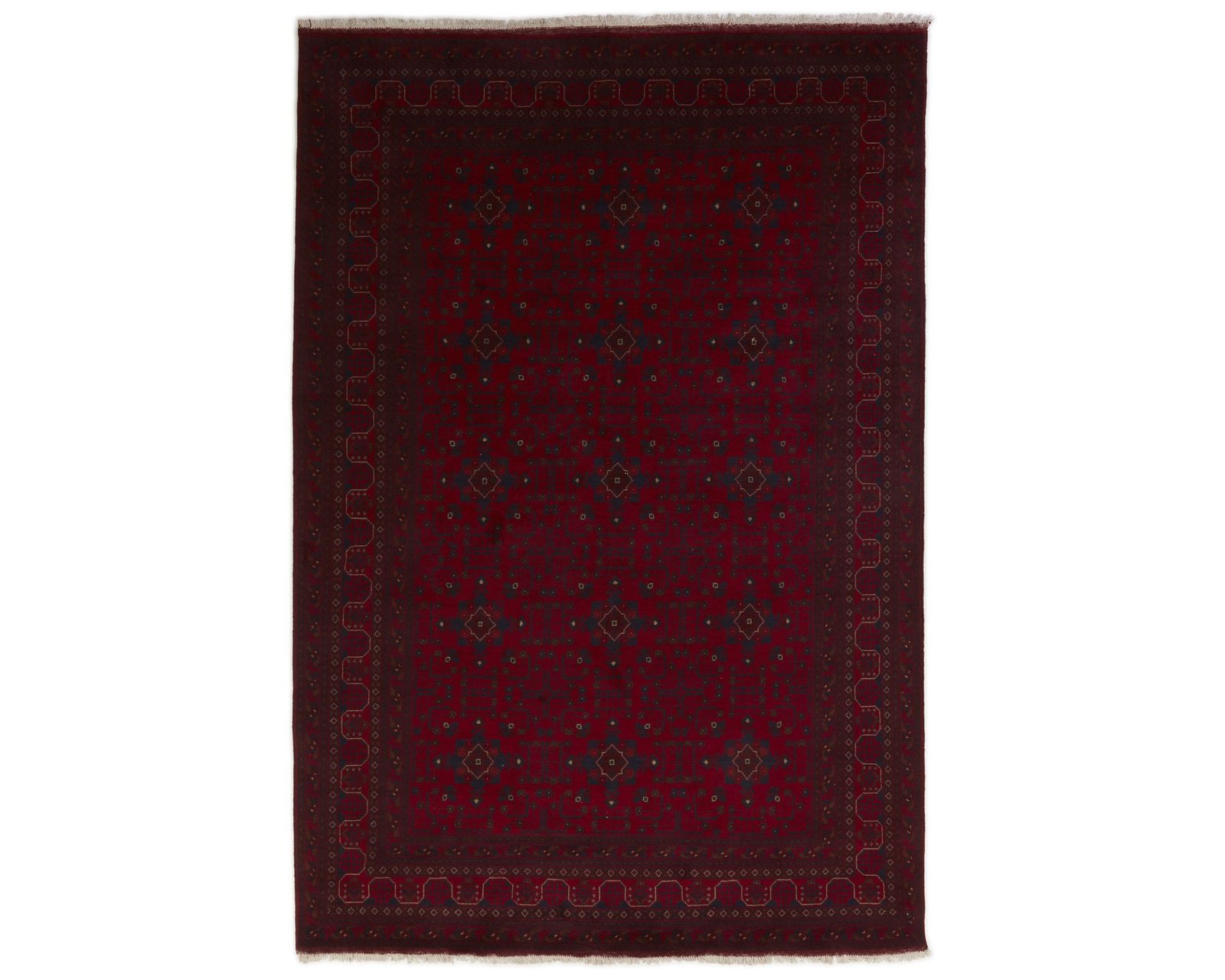 Old Afghan-mattorna är handknutna ullmattor som utmärks av en djup, varm röd bottenfärg kombinerad med mörkblå mönsterdetaljer samt inslag av ockra och beige. Den relativt höga, stadiga luggen innehåller ofta get- och hästhår, vilket ger mattorna en robust karaktär. Traditionella Gül-motiv och senehknutning skapar en rytmisk mönsterstruktur. Knuttätheten ligger mellan 150 000 och 250 000 knutar per kvadratmeter. Oanvänd.