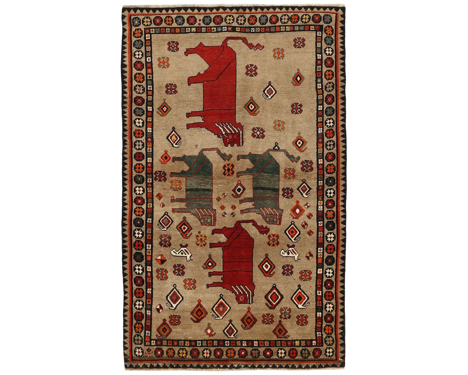 Old Figural Kashghai-mattorna har samma handknutna ullkonstruktion och kraftfulla färgskala som övriga Kashghai-mattor. De kännetecknas av geometriska kompositioner som även inkluderar figurer som djur och människor. Mattorna har en kompakt och robust struktur med fin knutning som ger ytan djup. Knuttätheten ligger mellan 150 000 och 250 000 knutar per kvadratmeter. Oanvänd.