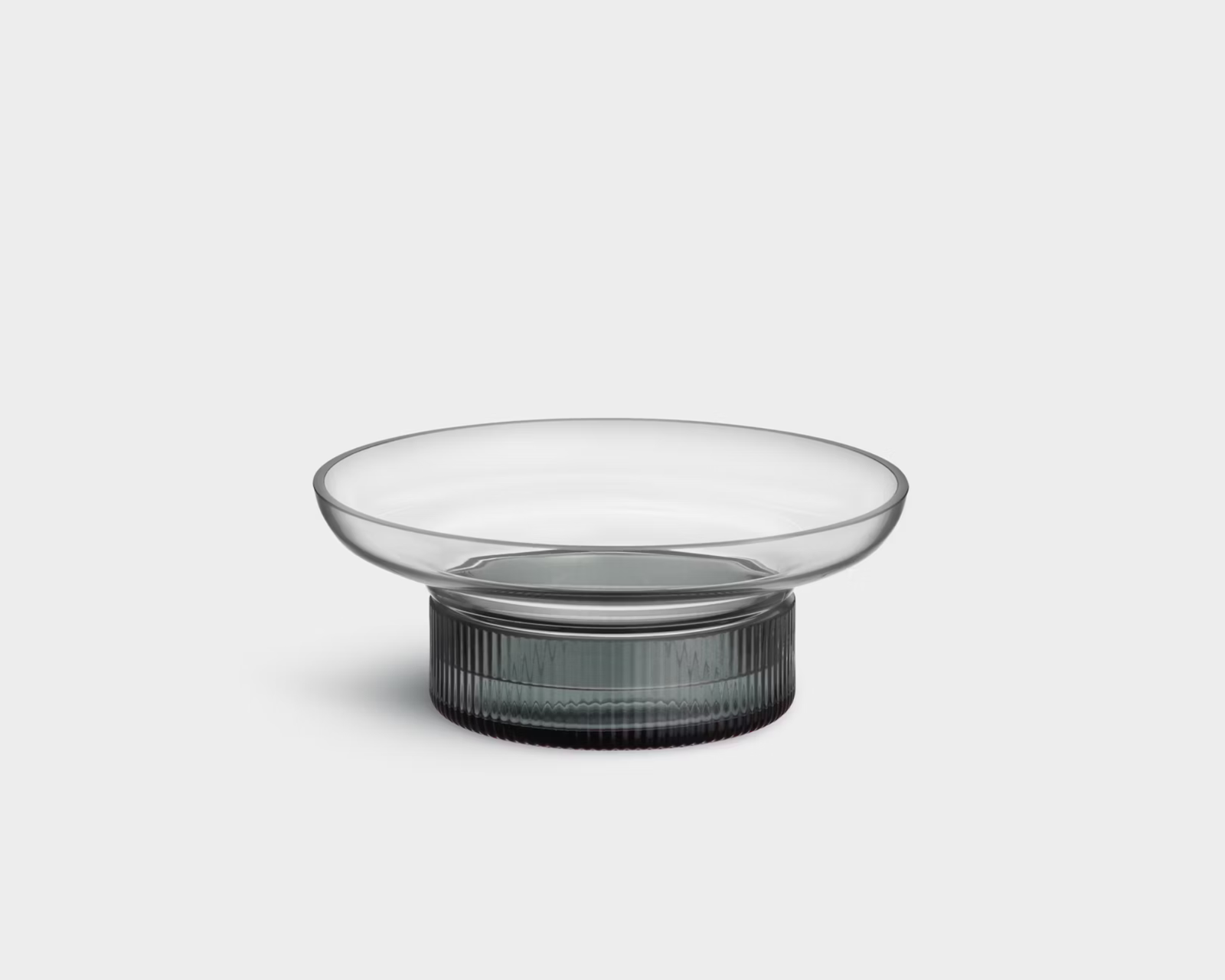 Orrefors Ensemble vas 60 mm, rökblå/grå. Vasen är designad av den brittiske formgivaren Benjamin Hubert. Den tvådelade konstruktionen och den låga siluetten framhäver det minimalistiska uttrycket och lyfter fram allt du placerar i den. Oanvänd.