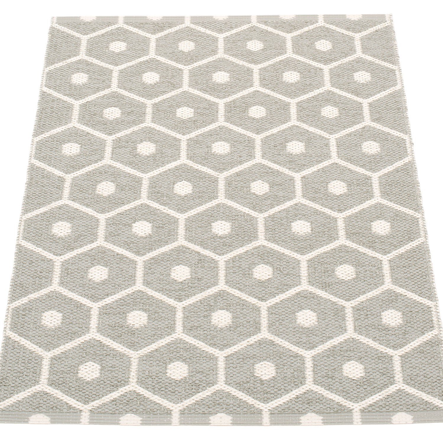 Honey Warm Grey/Vanilla är en plastmatta för inom- och utomhusbruk, tillverkad i Sverige. Svetsade kanter med förstärkningsband för hög slitstyrka, med graverad logotype i båda ändar. Mattan vävs av svensktillverkade ftalatfria plastband från Gislaved Folie AB i traditionella vävstolar. Enkel att underhålla och rengöra, handtvätt eller maskintvätt 30°C utan centrifugering. Storleksavvikelser på ±4% kan förekomma pga vävtekniska skäl. Tjocklek ca 5 mm.