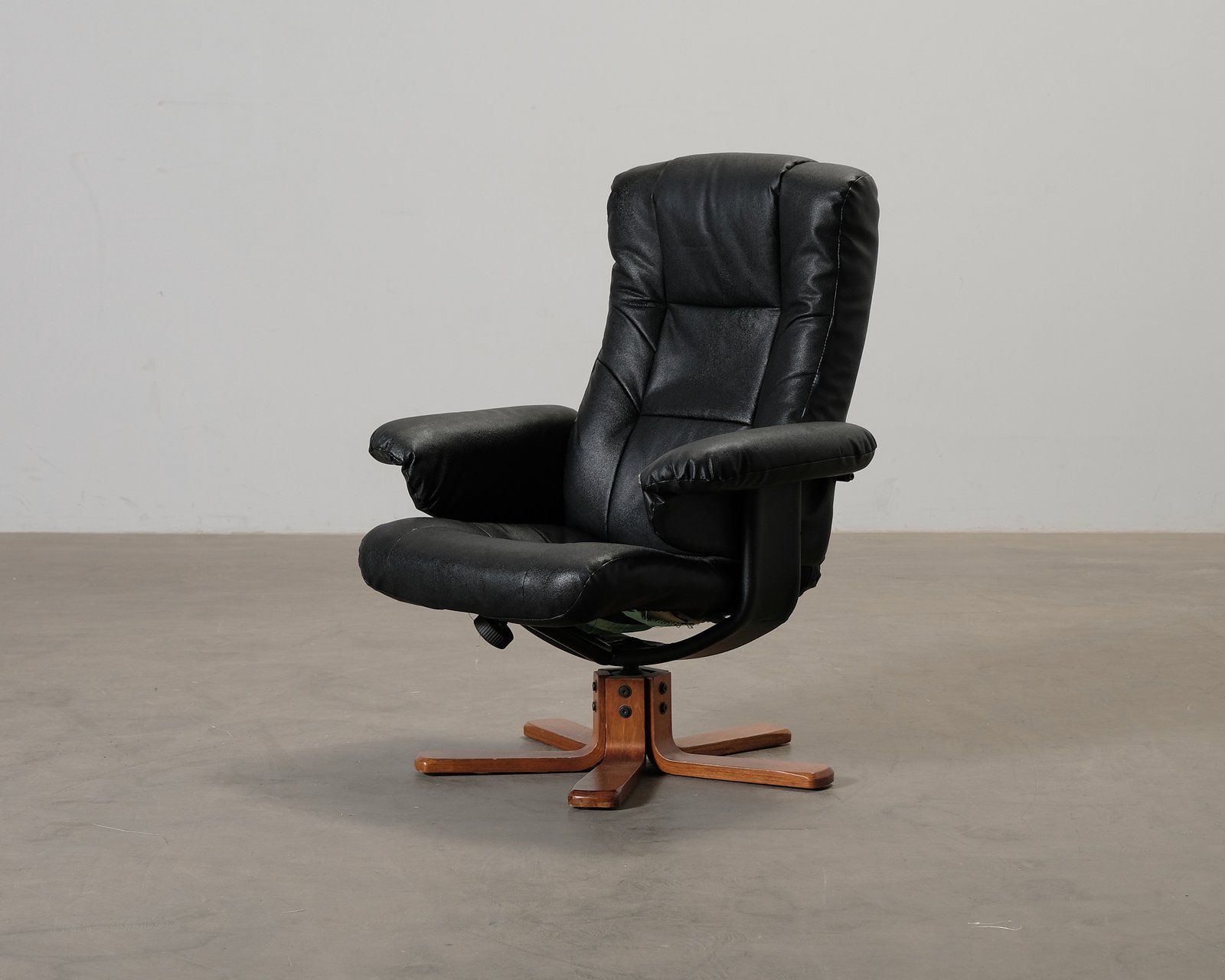 En tidlös fåtölj med reclinerfunktion och svängbar bas som gör det extra bekvämt att koppla av. Svart konstläderklädsel och en träbas kompletterar fåtöljens eleganta utseende. Slitage på klädseln och ett litet hål i ett armstöd. En repa bakom ryggstödet och ett hål i tyget på undersidan. Slitage och bucklor på basen.