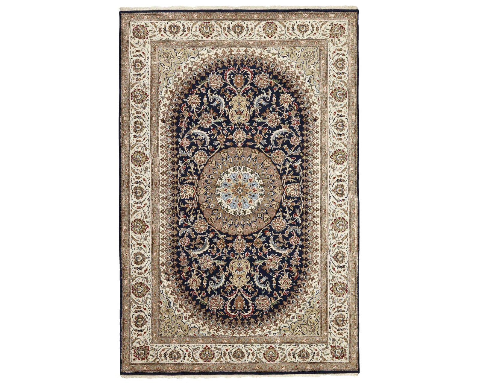 Nain Indi-mattorna är handknutna i Indien med ulllugg och inspirerade av klassiska persiska Nain-mattor. De har ett centralt medaljongmönster omgivet av blommotiv som löper över hela ytan. Färgskalan är harmonisk, och knuttätheten ligger på 250 000–350 000 knutar per kvadratmeter, vilket ger mattorna en detaljrik och elegant karaktär. Oanvänd.