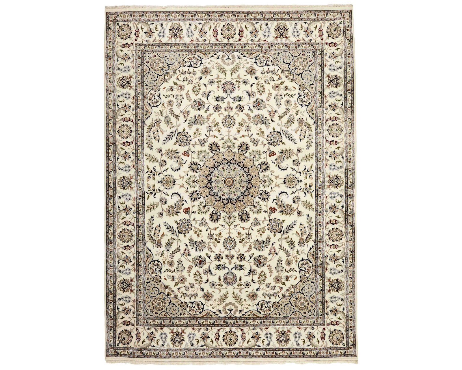 Nain Indi-mattorna är handknutna i Indien med ulllugg och inspirerade av klassiska persiska Nain-mattor. De har ett centralt medaljongmönster omgivet av blommotiv som löper över hela ytan. Färgskalan är harmonisk, och knuttätheten ligger på 250 000–350 000 knutar per kvadratmeter, vilket ger mattorna en detaljrik och elegant karaktär. Oanvänd.