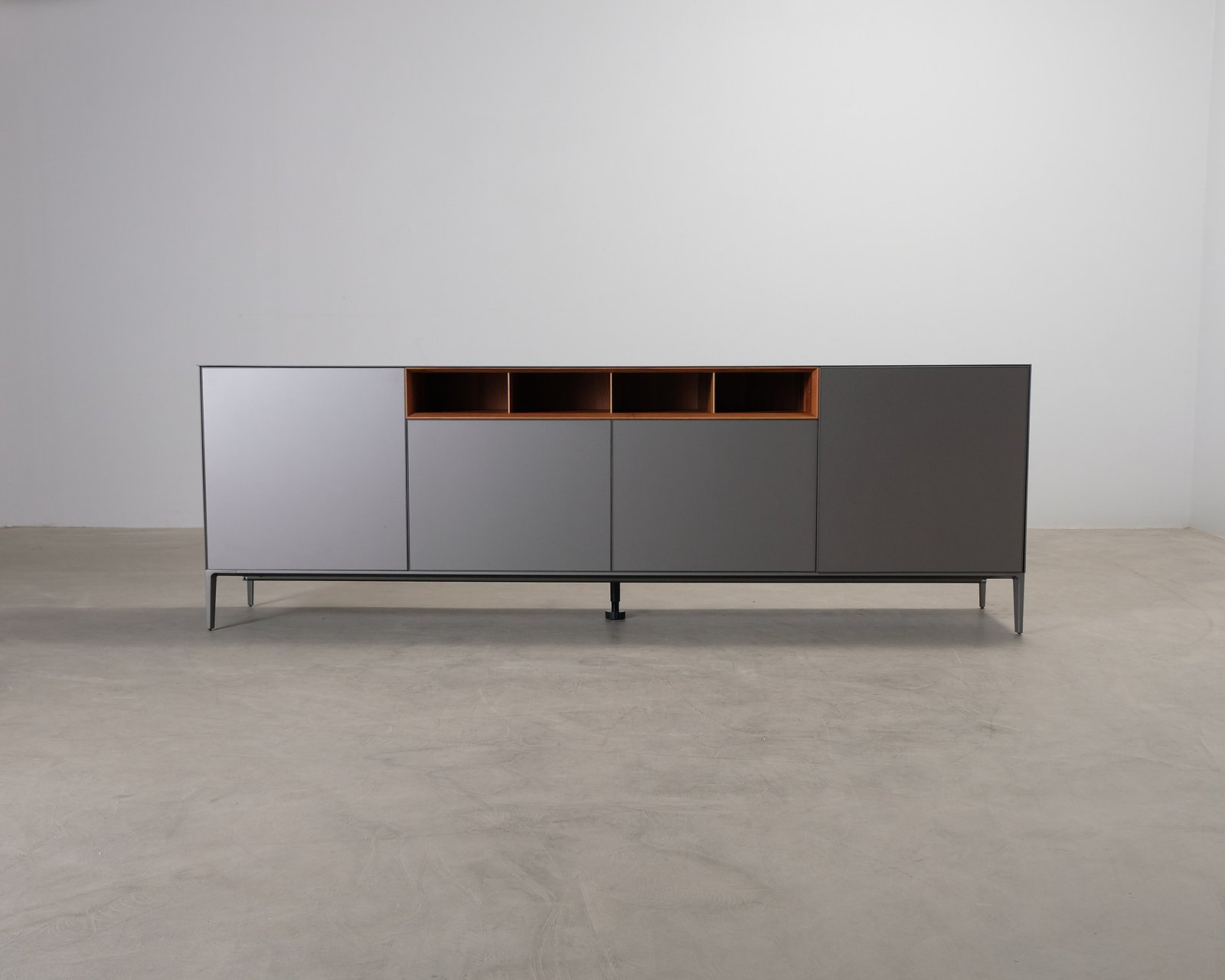 Rimadesion Self Up är en elegant och modern skänk som ger ett sofistikerat intryck i hemmet. Dess minimalistiska design och diskreta färgskala gör den lätt att kombinera med en mängd olika inredningar. De smala aluminiumbenen ger den ett vackert lätt utseende. Designad av Giuseppe Bavuso. Normalt slitage, repor och gropar på ovansidan och repor på dörrarnas kanter. Bra helhetsintryck.