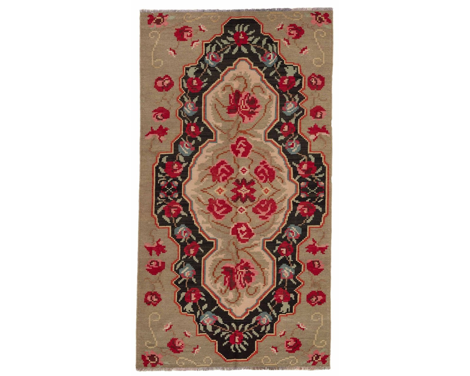 Rose Kelim-mattorna är handvävda ullmattor från Moldavien och norra Turkiet. De är tillverkade med en särskild slätvävsteknik som ger mattorna en tunn, filtliknande yta. Rose Kelim-mattorna är ofta äldre och relativt sällsynta, och kännetecknas av rika blommönster i starka färger mot en mörk bakgrund. Oanvänd.