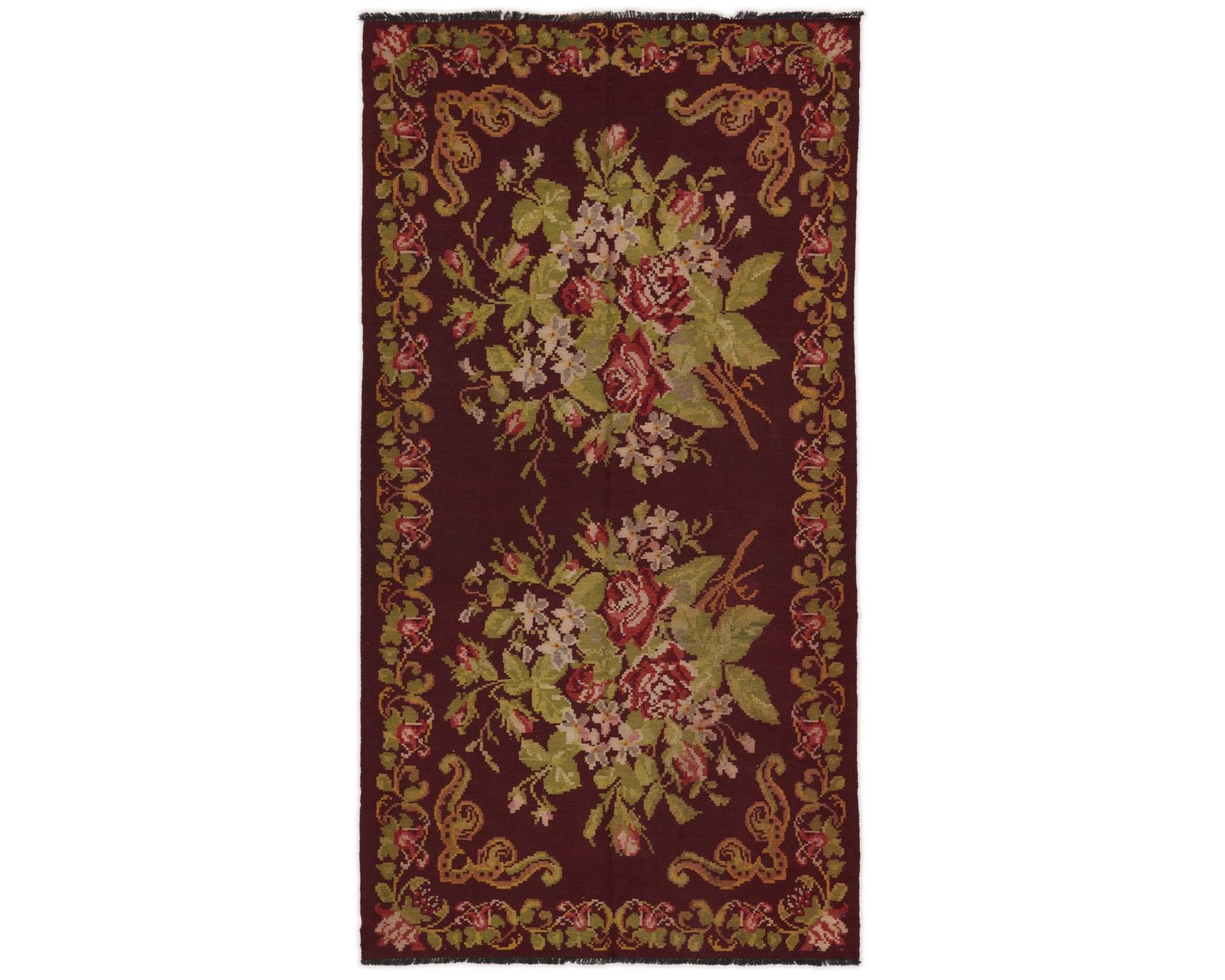 Rose Kelim-mattorna är handvävda ullmattor från Moldavien och norra Turkiet. De är tillverkade med en särskild slätvävsteknik som ger mattorna en tunn, filtliknande yta. Rose Kelim-mattorna är ofta äldre och relativt sällsynta, och kännetecknas av rika blommönster i starka färger mot en mörk bakgrund. Oanvänd.