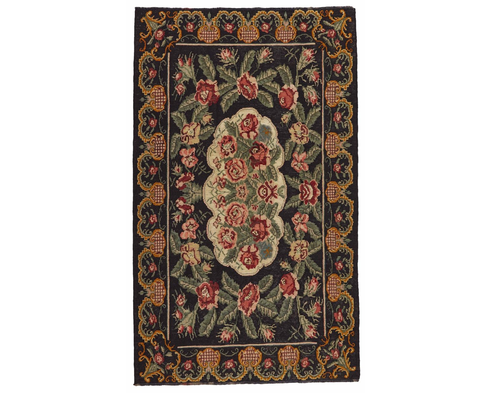 Rose Kelim-mattorna är handvävda ullmattor från Moldavien och norra Turkiet. De är tillverkade med en särskild slätvävsteknik som ger mattorna en tunn, filtliknande yta. Rose Kelim-mattorna är ofta äldre och relativt sällsynta, och kännetecknas av rika blommönster i starka färger mot en mörk bakgrund. Oanvänd.