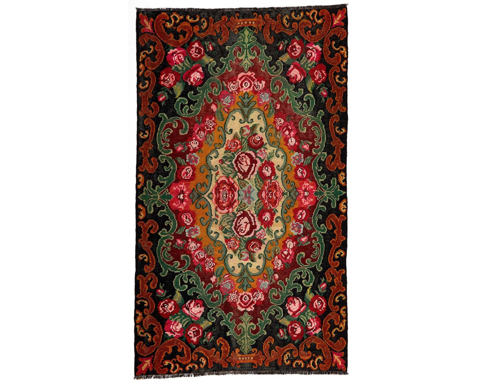 Rose Kelim-mattorna är handvävda ullmattor från Moldavien och norra Turkiet. De är tillverkade med en särskild slätvävsteknik som ger mattorna en tunn, filtliknande yta. Rose Kelim-mattorna är ofta äldre och relativt sällsynta, och kännetecknas av rika blommönster i starka färger mot en mörk bakgrund. Oanvänd.