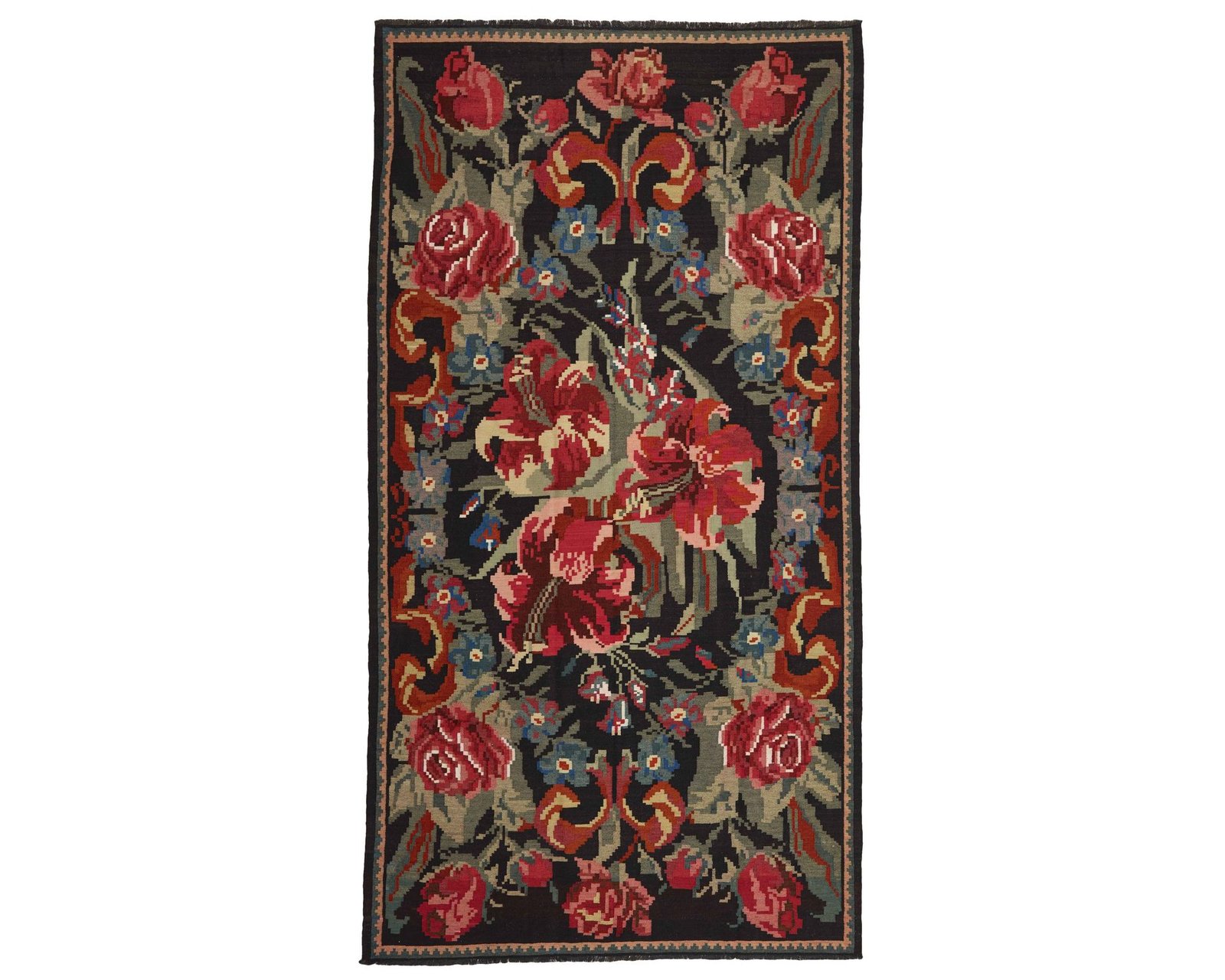 Rose Kelim-mattorna är handvävda ullmattor från Moldavien och norra Turkiet. De är tillverkade med en särskild slätvävsteknik som ger mattorna en tunn, filtliknande yta. Rose Kelim-mattorna är ofta äldre och relativt sällsynta, och kännetecknas av rika blommönster i starka färger mot en mörk bakgrund. Oanvänd.