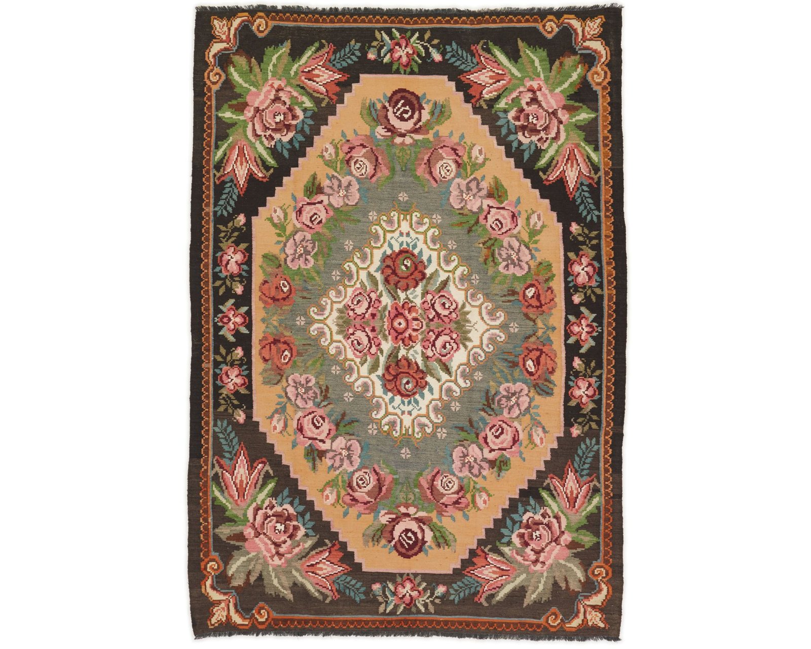 Rose Kelim-mattorna är handvävda ullmattor från Moldavien och norra Turkiet. De är tillverkade med en särskild slätvävsteknik som ger mattorna en tunn, filtliknande yta. Rose Kelim-mattorna är ofta äldre och relativt sällsynta, och kännetecknas av rika blommönster i starka färger mot en mörk bakgrund. Oanvänd.