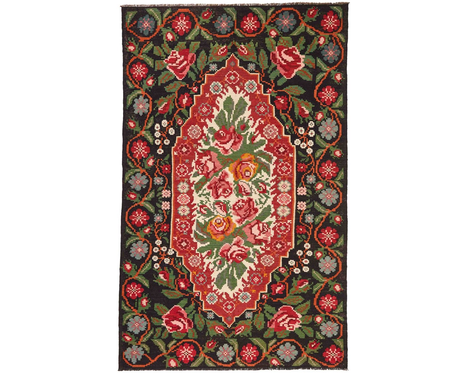 Rose Kelim-mattorna är handvävda ullmattor från Moldavien och norra Turkiet. De är tillverkade med en särskild slätvävsteknik som ger mattorna en tunn, filtliknande yta. Rose Kelim-mattorna är ofta äldre och relativt sällsynta, och kännetecknas av rika blommönster i starka färger mot en mörk bakgrund. Oanvänd.