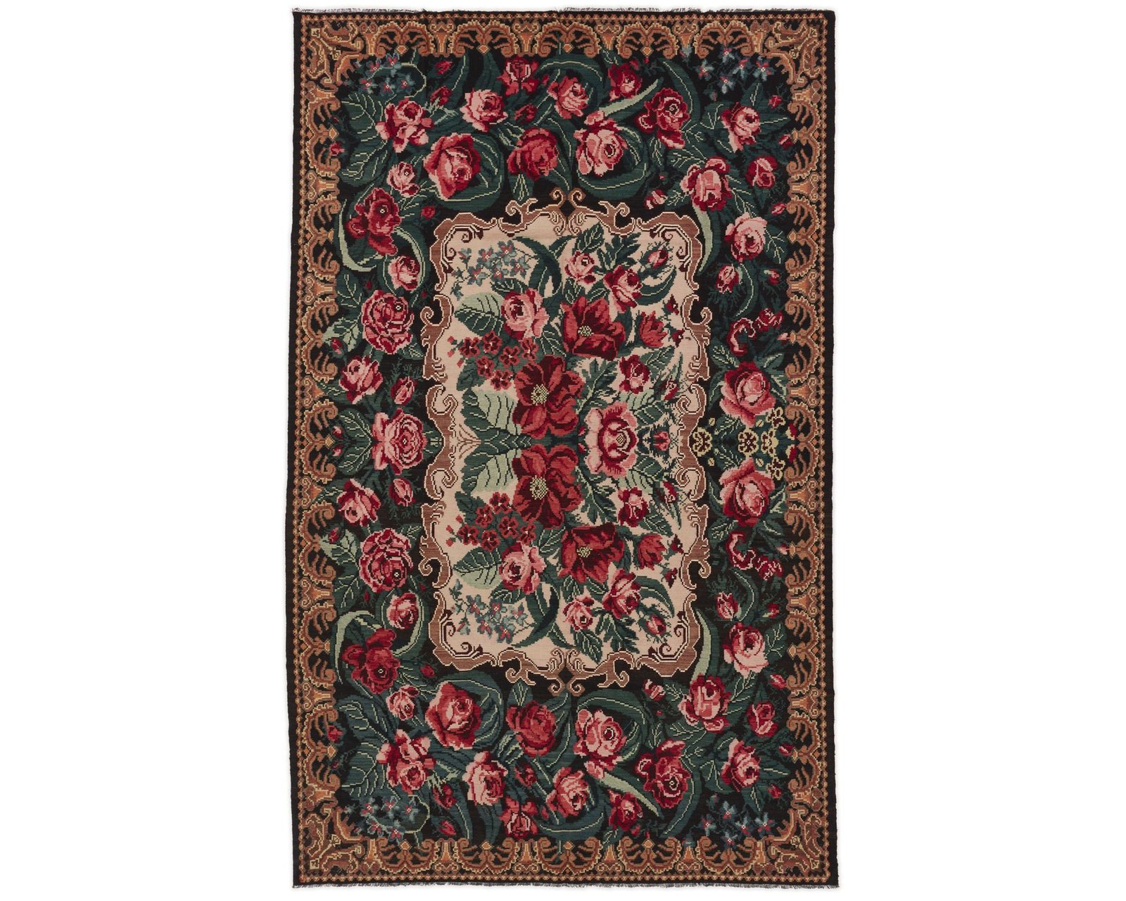 Rose Kelim-mattorna är handvävda ullmattor från Moldavien och norra Turkiet. De är tillverkade med en särskild slätvävsteknik som ger mattorna en tunn, filtliknande yta. Rose Kelim-mattorna är ofta äldre och relativt sällsynta, och kännetecknas av rika blommönster i starka färger mot en mörk bakgrund. Oanvänd.