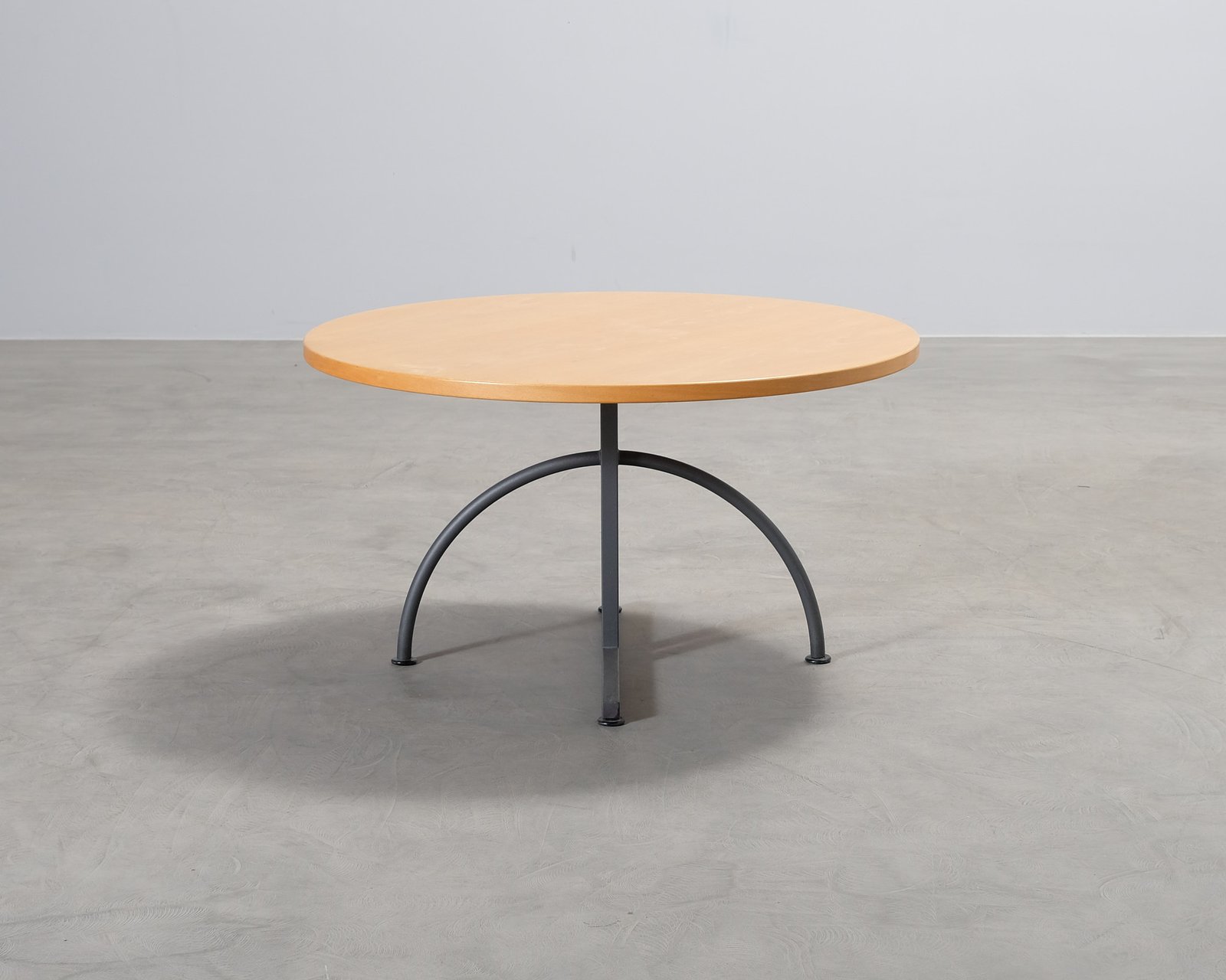 Runt soffbord. Tunna metallben och bordsskiva i trä. Slitage på bordsskivans lackyta.