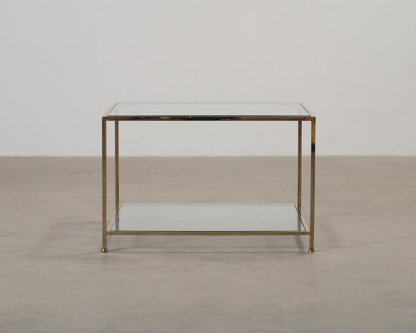Soffbordet Big Square från Ruth & Joanna består av två glasskivor och en metallram. Den tidlösa och minimalistiska designen gör soffbordet Big Square passande för många olika inredningsstilar. Slitage och repor på både ramen och glasskivorna.