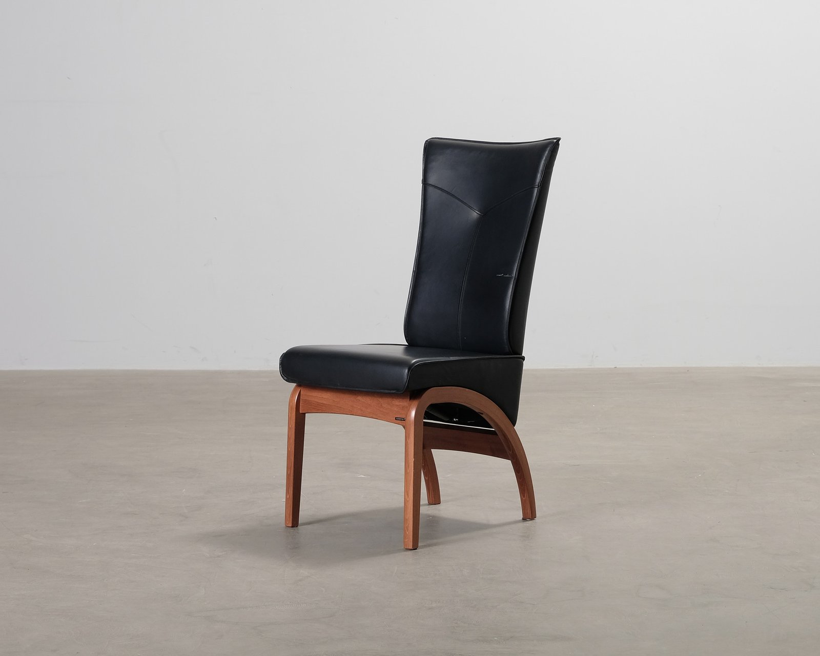 Snygg matstol med träben och klädsel i svart läder från Sandvik Møbel. Tack vare det höga och justerbara ryggstödet erbjuder stolen utmärkt sittkomfort. Normalt bruksslitage och fördjupningar. Helhetsintrycket är bra. Justeringen av ryggstödet fungerar bra.
