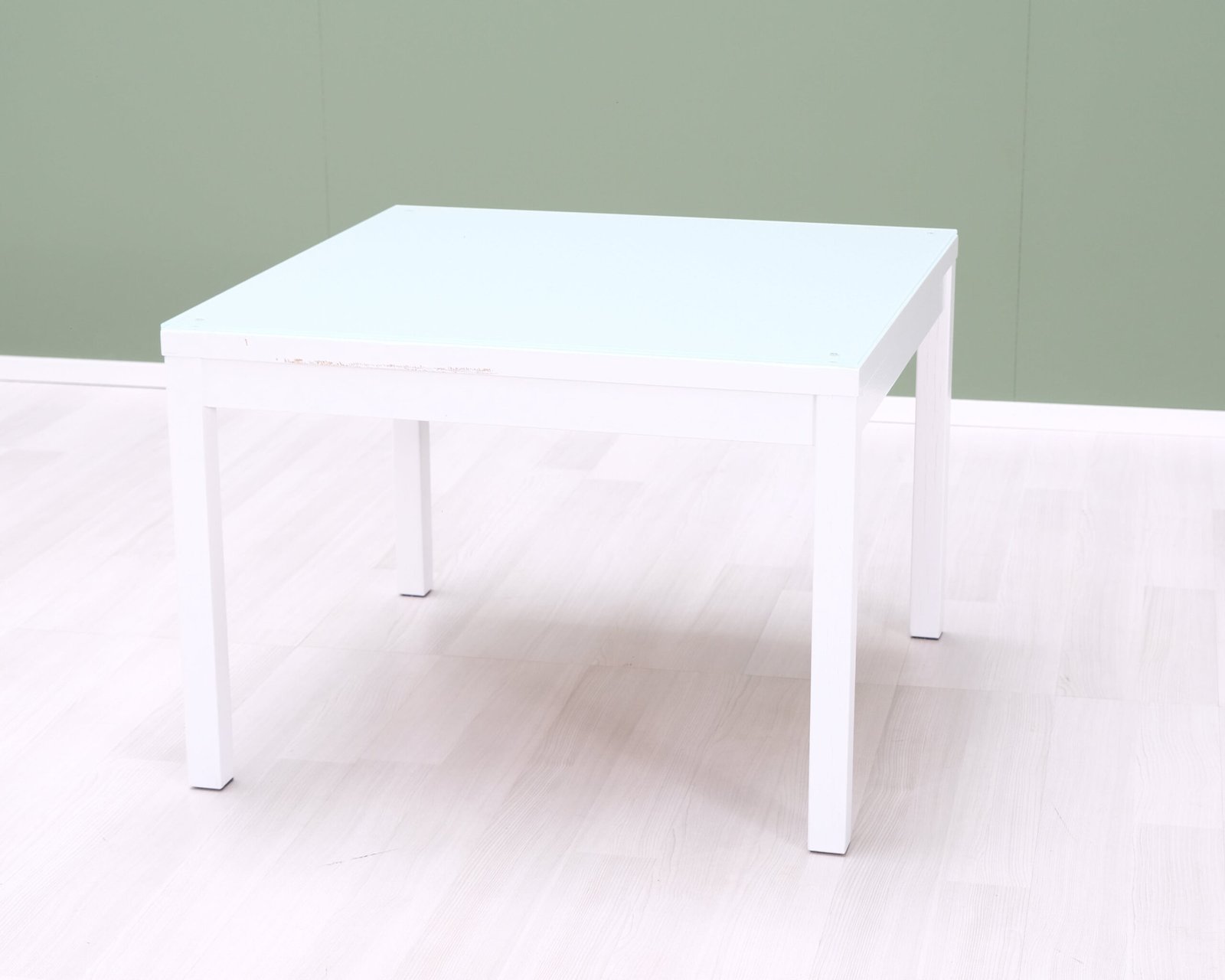 Fyrkantigt sidobord. Vit stomme och en glasskiva som skyddar bordsskivan. Lätt mönster på glasskivan. Slitage på kanterna.