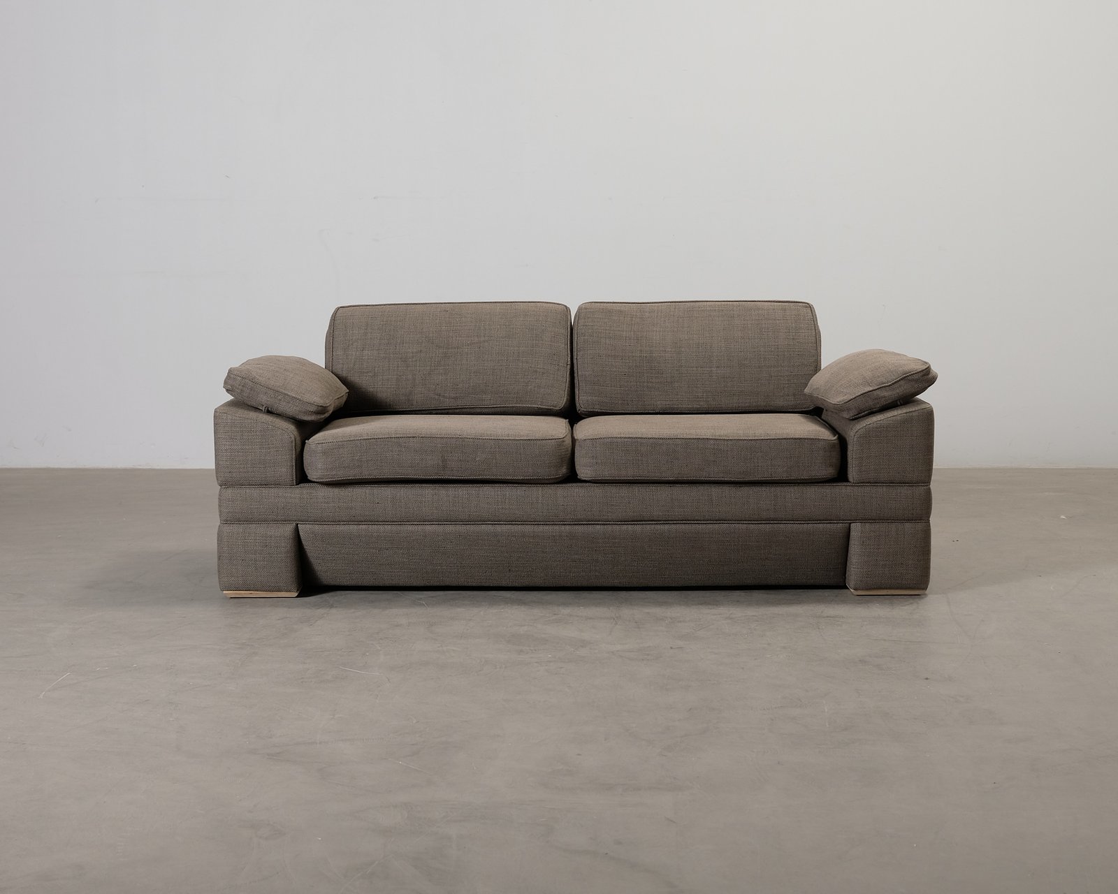 Den högkvalitativa soffan Basic från Skanno erbjuder utmärkt komfort, och dess vackra bruna tygklädsel gör den lätt att kombinera med olika inredningsstilar. Klädsel: Pierre Frey Shanghai. Normalt bruksslitage. Helhetsintrycket är bra.
