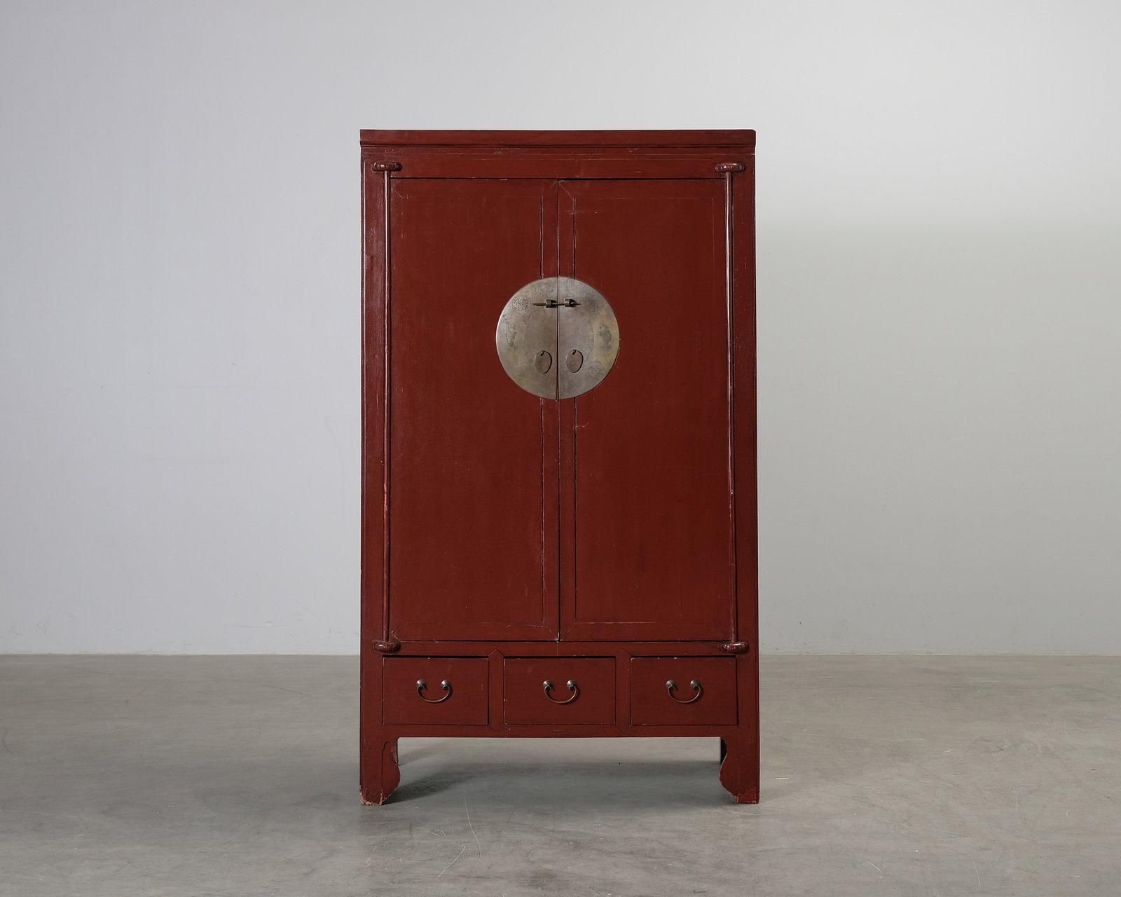 Vackert och unikt skåp i kinesisk stil. Den vackert patinerade ytan och det karakteristiska låssystemet gör skåpet till ett iögonfallande inslag i inredningen. Inuti finns rymliga öppna hyllor samt tre små lådor. Dekorlisten på vänster ben är bruten. Slitage, bucklor, patina och repor. Helhetsintrycket är bra.