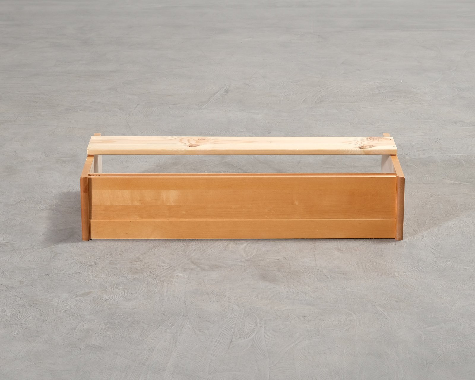 Träsockel till bokhyllan. Bruksslitage och stötmärken. Helhetsintrycket är gott.