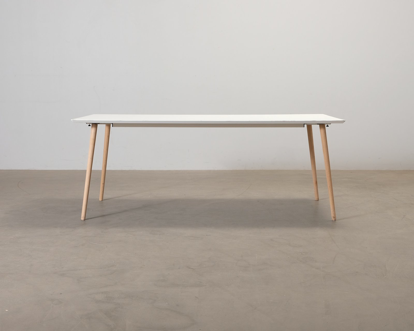 Allie är ett klassiskt matbord med en simpel och elegant design. Matbordet har vinklade ben i massiv såpad ek och bordsskiva i vitt laminat, vilket ger bordet ett mycket klassiskt utseende. Bordsskivan har slitage och bucklor. Bordet är något ostadigt. Inkluderar två 45 x 100 cm förlängningsdelar.