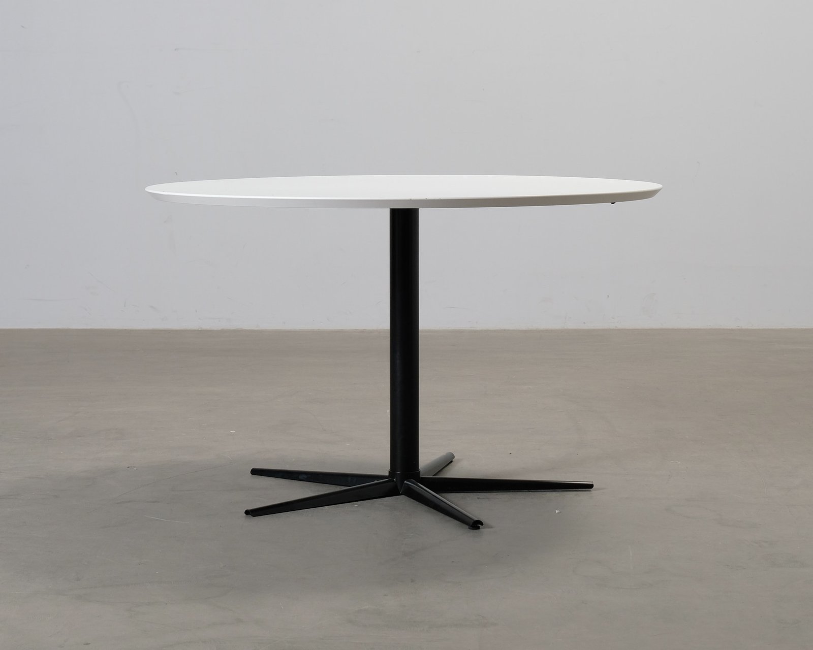 Allie från Sofacompany är ett klassiskt matbord med en enkel, elegant design. Den vita laminatskivan är lätt att hålla ren och mycket tålig. Bordet har en diameter på 120 cm och rymmer bekvämt fyra personer. Det finns repor på bordsskivan och en liten bit har lossnat från kanten. Helhetsintrycket är bra.
