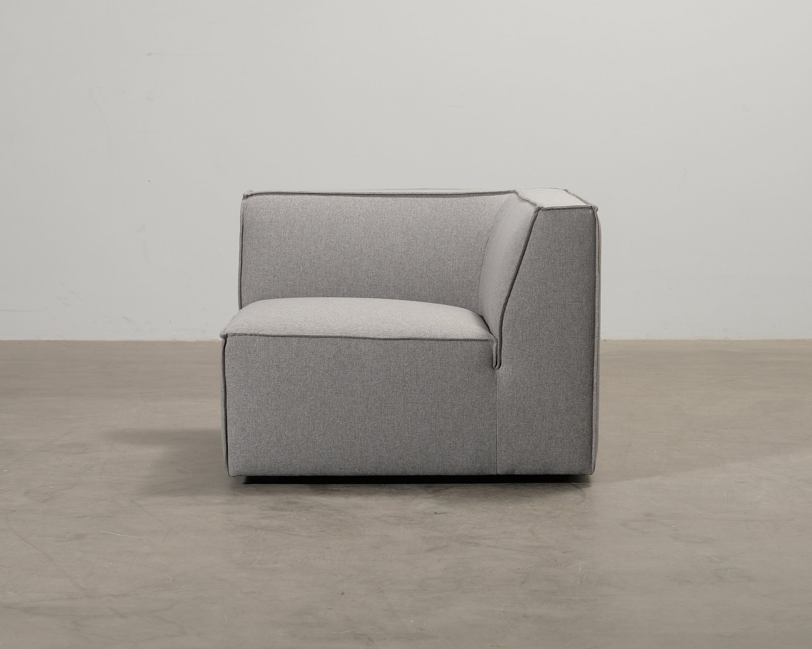 En hörnmodul från Sofacompanys modulära Dane-serie, klädd i grått tyg. De vikta sömmarna framhäver modulens konturer och de osynliga benen ger möbeln ett lätt helhetsintryck. Den inre träramen är tillverkad av FSC-certifierat trä. Designad av Nikoline Tryde Hølund. Klädsel: Olena Light Grey. Oanvänd
