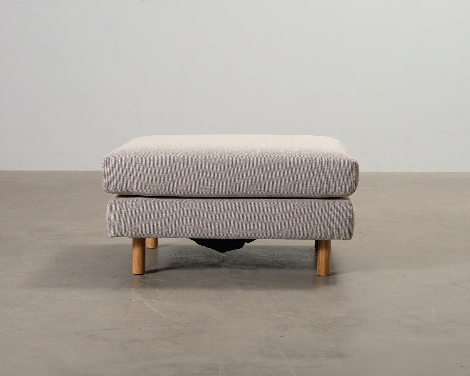 En pall som tillhör möbelserien Douglas från Sofacompany. Träbenen gör att pallen ser lätt ut trots sin storlek. Klädsel: Agnes Brown. Repa i bottentyget.