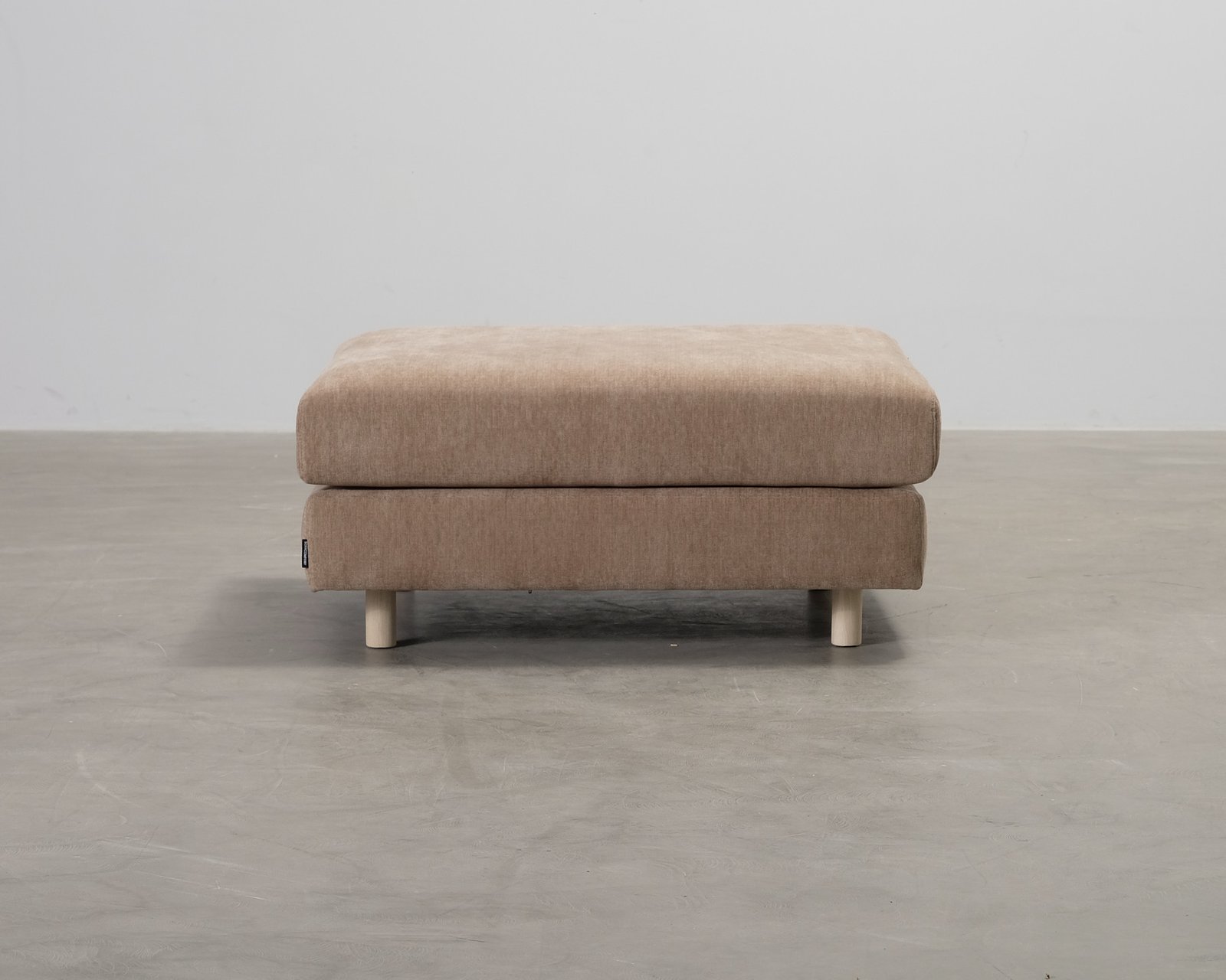 En pall som tillhör möbelserien Douglas från Sofacompany. Träbenen gör att pallen ser lätt ut trots sin storlek. Klädsel: Aulla Caramel. Oanvänd.