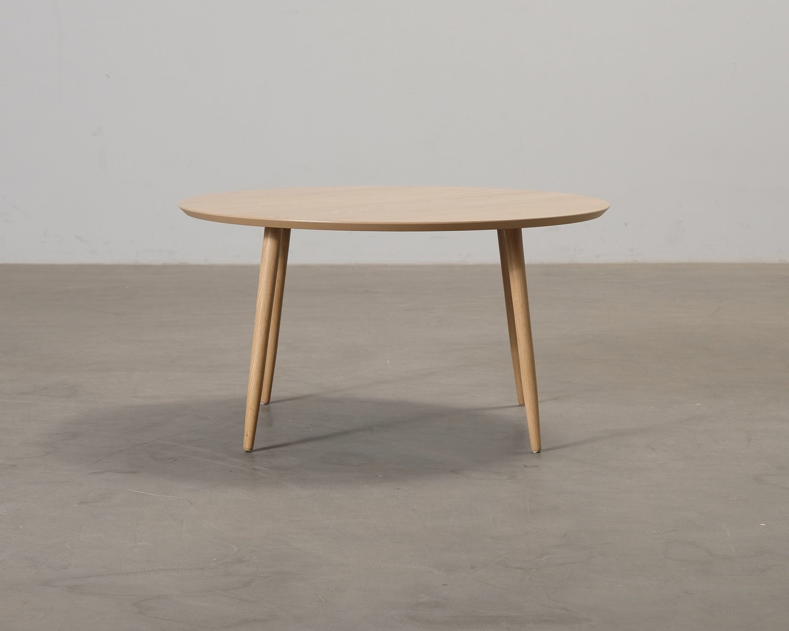 Hubert är ett klassiskt soffbord med fyra konformade ben och en rund bordskiva. Här har den en bordskiva av ekfaner med unik ådring och ben i såpad massiv ek. Bordet är producerat i Danmark och tillverkat av FSC-certifierat trä. Liten buckla i bordsskivan. Helhetsintrycket är fint.
