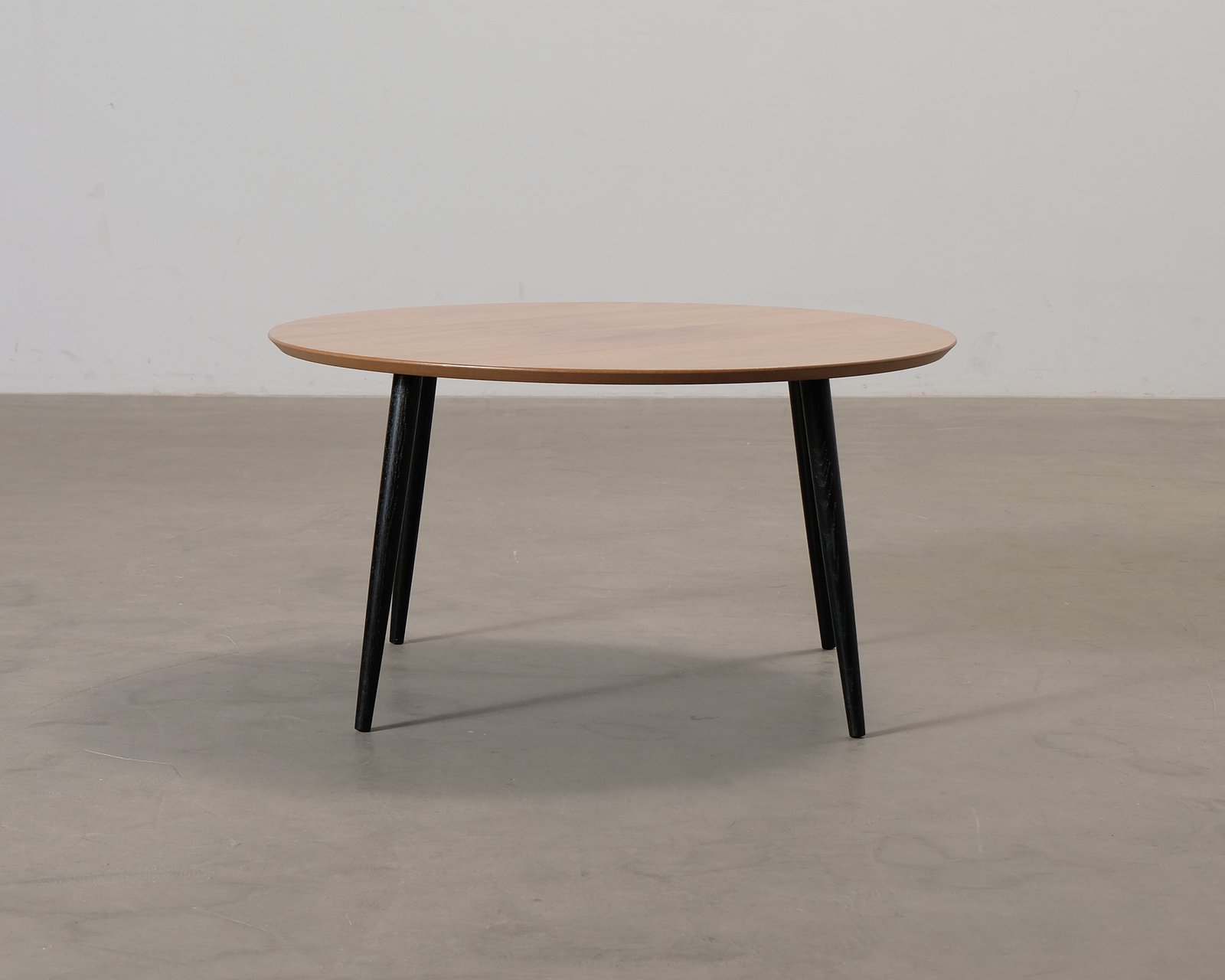 Hubert är ett klassiskt soffbord med fyra konformade ben och en rund bordskiva. Här har den en bordskiva av valnötsfaner med unik ådring och ben i såpad massiv ek. Bordet är producerat i Danmark och tillverkat av FSC-certifierat trä. Repor och bucklor.