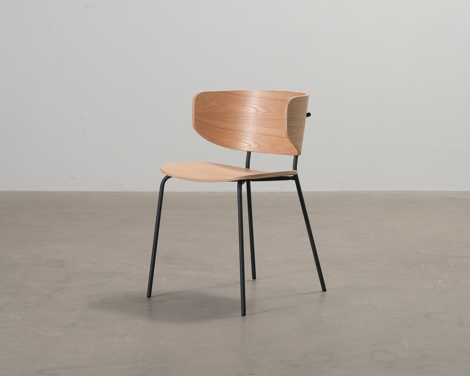 Jordan från Sofacompany är en arkitektonisk och skulptural matstol med ett stort, svängt ryggstöd för god sittkomfort och tunna metallben ger en luftig silhuett. Små repor och bucklor. Skador på kanter.