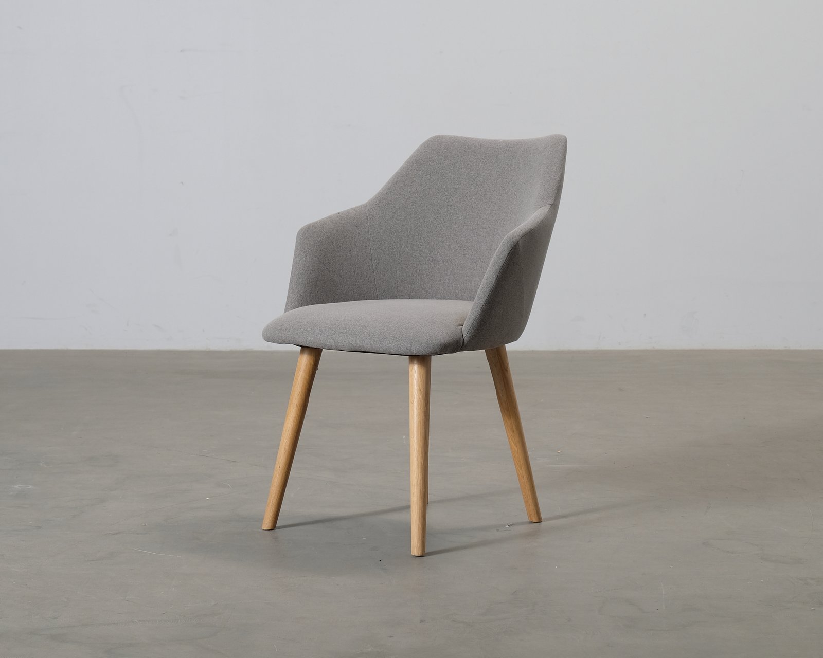 Sofacompanys Vica är en elegant matstol med en stoppad sits som ger utmärkt komfort. De graciösa ekbenen och den högkvalitativa tygklädseln fulländar stolens snygga utseende. Färg: Andie Antracit. Litet hål i armstödet. Helhetsintrycket är fint.