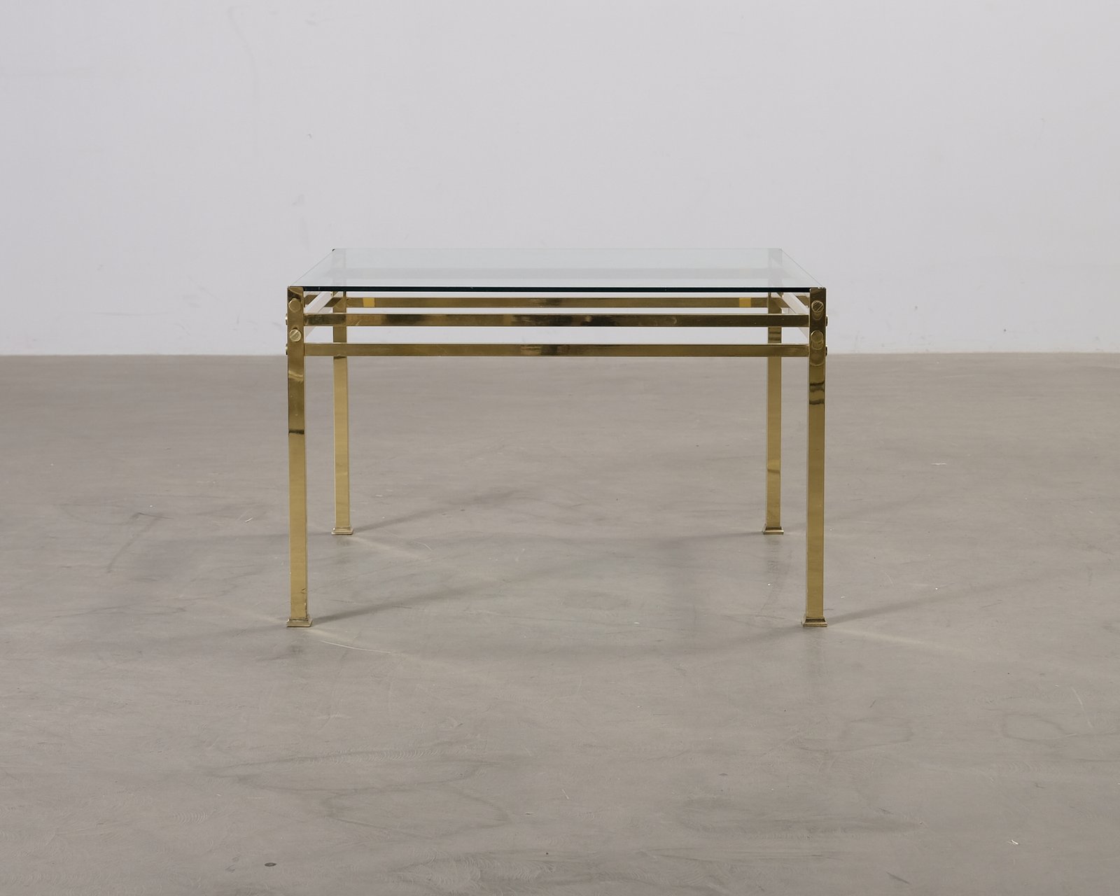 Ett elegant soffbord som fulländar det lyxiga utseendet i ditt vardagsrum. Guldfärgad metallram och bordsskiva i glas. Små spår av användning och repor. Två hörn på bordsskivan har små sprickor/flisor.