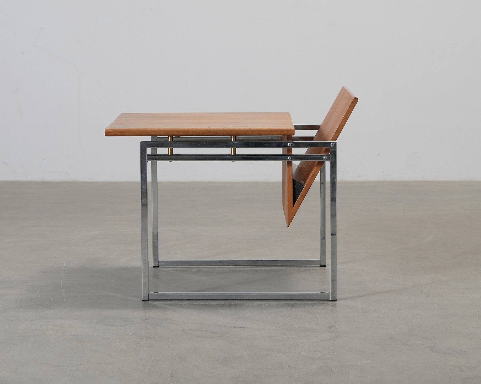 Ett stilrent och högkvalitativt soffbord med integrerat tidningsställ. Bordsskivan är i trä och ramen i metall. Normalt bruksslitage. Helhetsintrycket är bra.