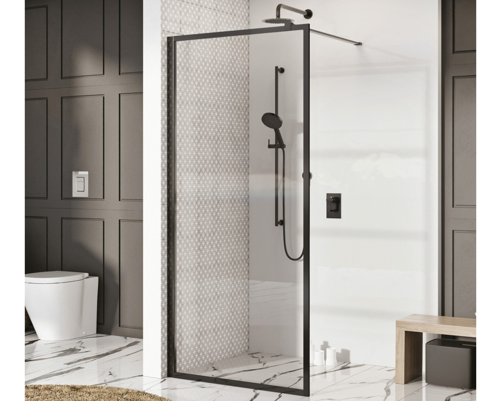 Duschväggen Höga Kusten är 200 cm hög och tillverkad i 6 mm klart glas med svarta aluminiumprofiler. Den medföljande stödpinnen kan monteras som tvär- eller diagonalstöd och fästs enkelt i både vägg och duschvägg – och kan kapas om du vill använda den diagonalt. Ena sidan har en utanpåliggande profil medan den andra är helt slät, vilket ger ett lätt uttryck och underlättar rengöringen. En stilren, rektangulär duschvägg som passar ett modernt badrum och vardagens rutiner.