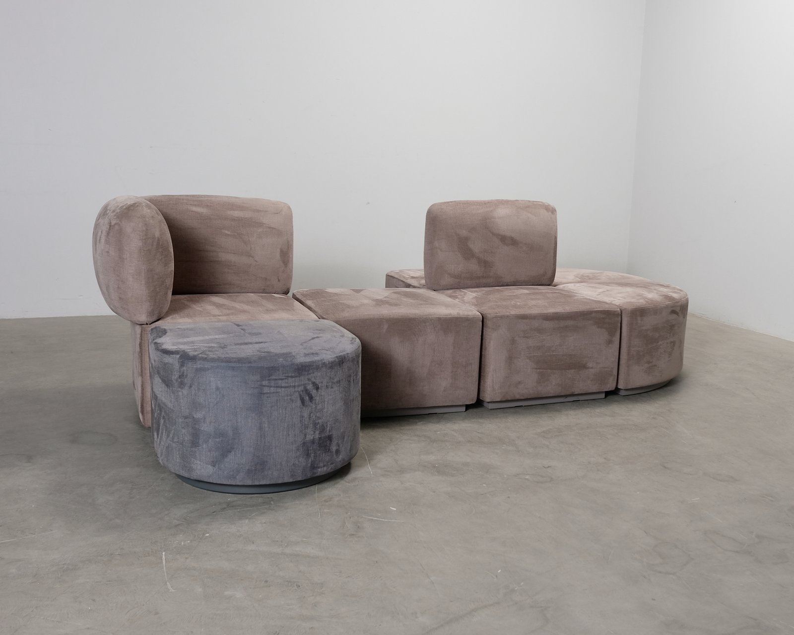 En skulptural lounge-soffa från Swedese, perfekt för kontor, lobbyer och andra offentliga miljöer. Modulerna kan vid behov omorganiseras till önskad konfiguration. Normala bruksspår. Helhetsintrycket är bra.
