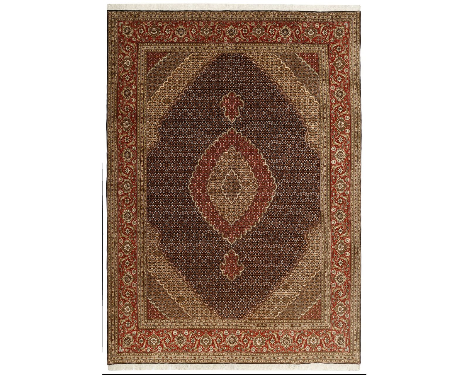 Tabriz 40 Mahi-mattorna är handknutna ullmattor med varp i bomull. Med en knuttäthet på cirka 400 000 knutar per kvadratmeter har ytan en fin detaljrikedom och tydlig definition, vilket speglar den höga kvaliteten hos Tabriz-mattor. Mönstret består av ett Mahi-mönster, där små bladliknande former upprepas tätt och bildar en sammanhängande, medaljongliknande komposition över mattans yta. Oanvänd.
