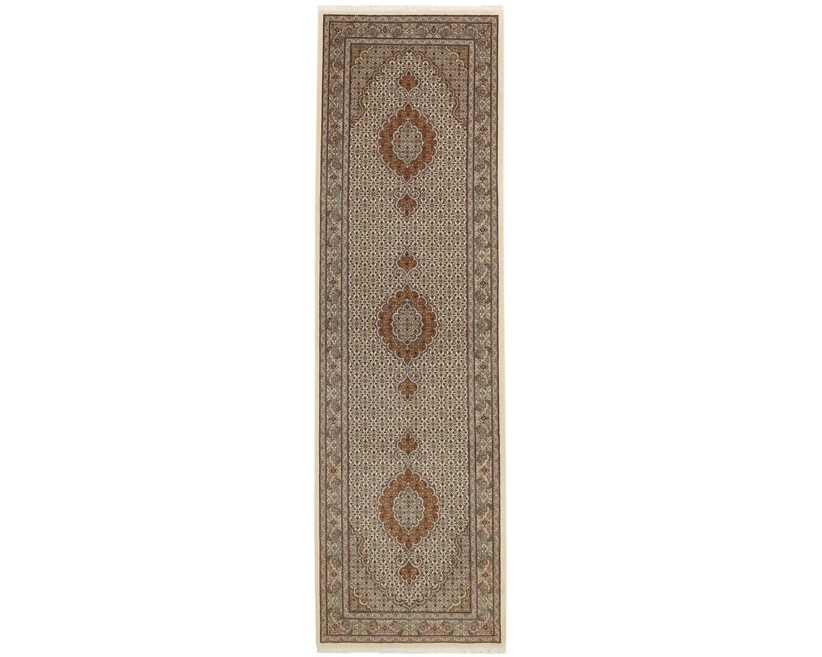 Tabriz 50 Mahi-mattorna är handknutna ullmattor med varp i bomull. Med en knuttäthet på cirka 500 000 knutar per kvadratmeter har ytan en fin detaljrikedom och tydlig definition, vilket speglar den höga kvaliteten hos Tabriz-mattor. Mönstret består av ett Mahi-mönster, där små bladliknande former upprepas tätt och bildar en sammanhängande, medaljongliknande komposition över mattans yta. Oanvänd.