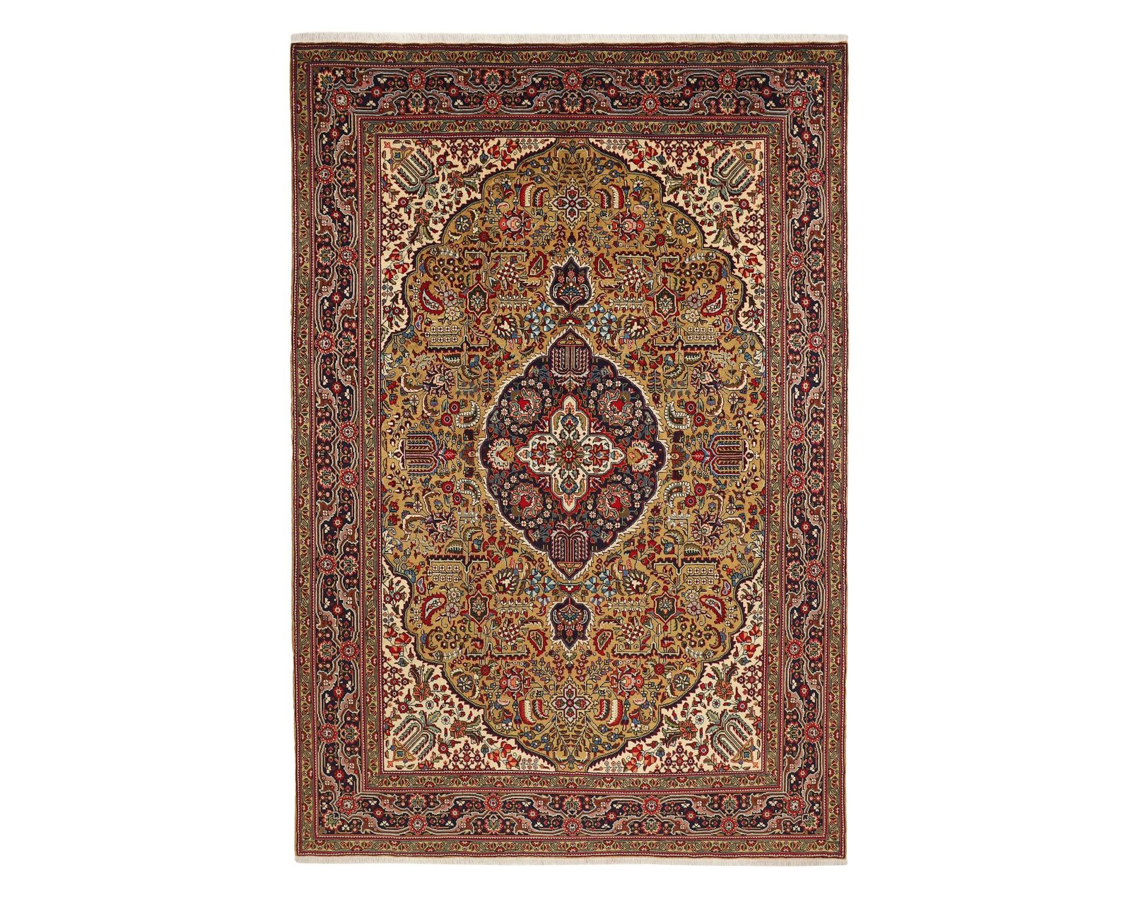 Tabriz-mattorna är handknutna med varp av bomull samt ulllugg, vilket ger mattorna en yta som är både slitstark och elegant. Mönstren sträcker sig från traditionella Herati-mönster till Nagsheh-kompositioner inspirerade av figurativa inslag från andra klassiska mattstilar. Färgskalan varierar med kvaliteten, där finare mattor uppvisar mer nyanserade och harmoniska toner. Knuttätheten ligger mellan 450 000 och 550 000 knutar per kvadratmeter. Oanvänd.
